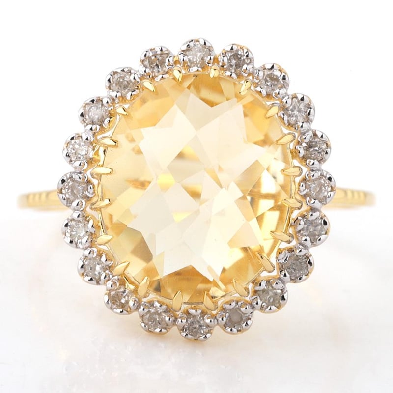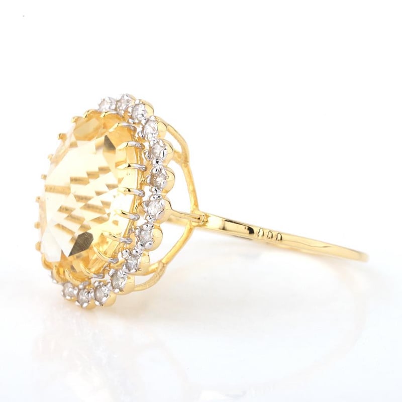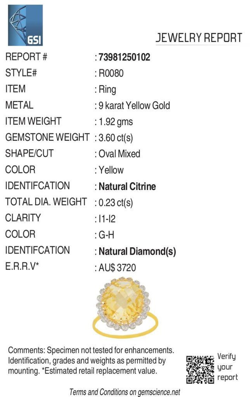 9CT YELLOW GOLD NATURAL CITRINE & DIAMOND RING WITH VALUATION Weight Of The Item: 1.92 GFineness Of Metal(S): Yellow Gold 9KtThe Ring Consists Of (1) Oval Brilliant Natural Citrine. Surrounding The Main Stones Are Round Brilliant Cut Natural Diamonds.Antique StyleIdentification: Natural CitrineColor: YellowShape: Oval Brilliant CutNo. Of Stone: 1Dimension: 12 Mm X 10 Mm X 7.2 MmWeight: 3.6 CaratsCut: Very GoodIdentification: Natural DiamondShape: Round Brilliant CutWeight: 0.23 CtsCut: ExcellentCondition: Brand New (Unsold Jewellery Store Stock) Refer To Gemmologist Report For Further Grading Notes Accompanied By Gemmologist Report Issued By Gemological Science International (Gsi).Replacement Retail Value:$3720 Markings: 9ct Condition: Good - Refer Images 0488580+1