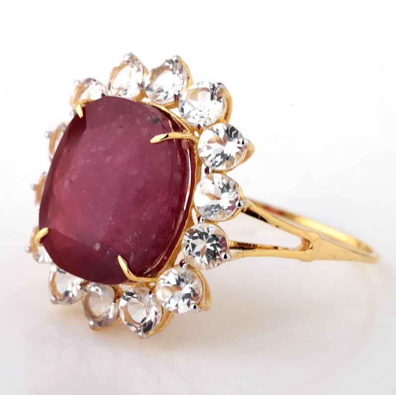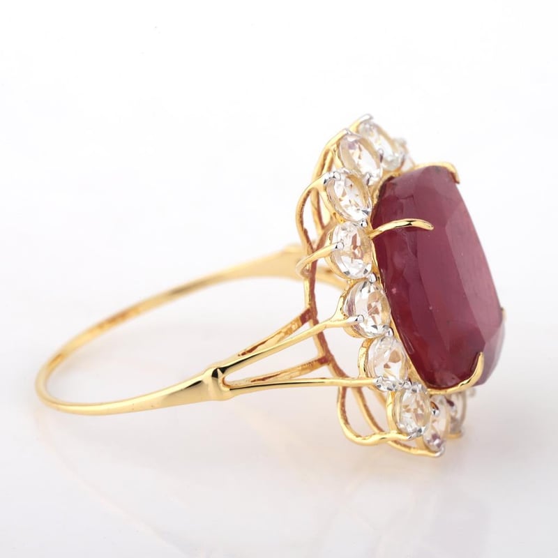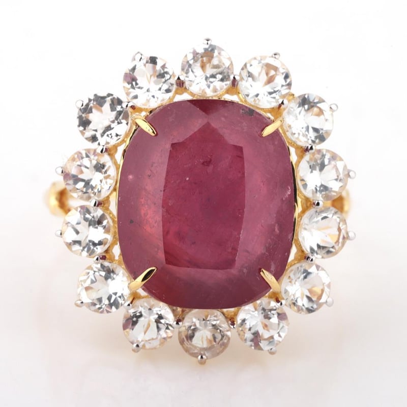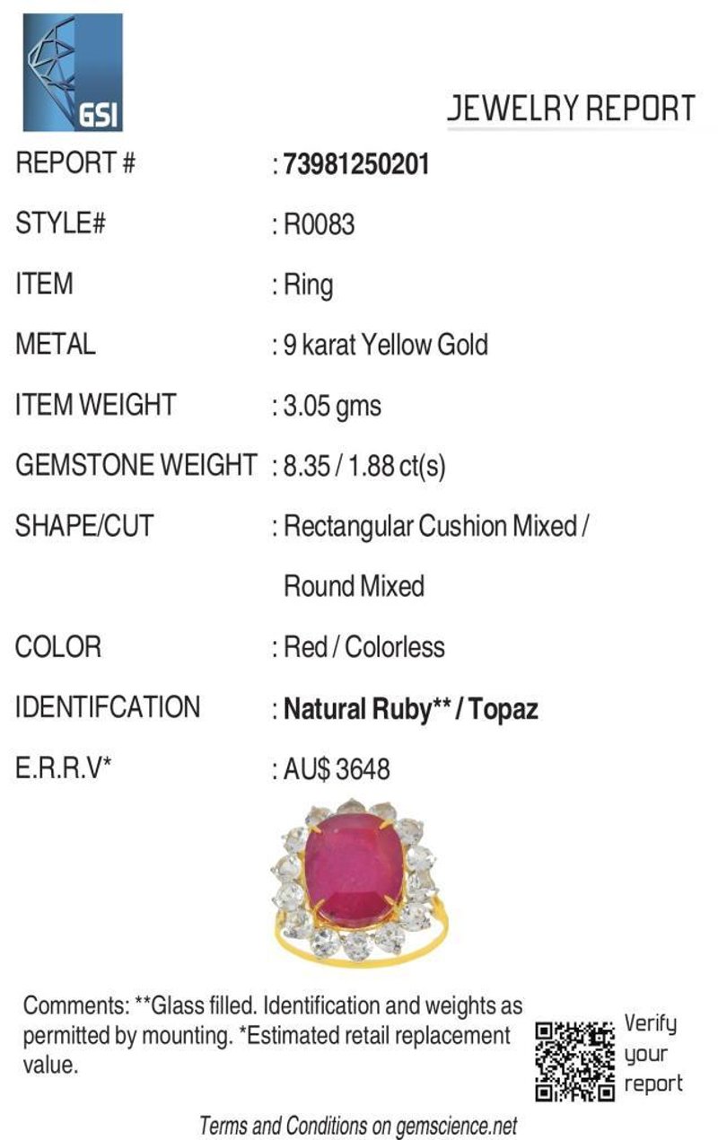 9CT YELLOW GOLD NATURAL RUBY / NATURAL WHITE TOPAZ RING WITH VALUATION Weight Of The Item: 3.05 GFineness Of Metal(S): Yellow Gold 9KtThe Ring Consists Of (1) Cushion Brilliant Natural Ruby & (14) Round Brilliant Cut White Topaz.Antique StyleIdentification: Natural Ruby / Natural White TopazColor: Red / WhiteShape: Cushion Brilliant Cut / Round Faceted CutNo. Of Stone: 15Dimension: 12 Mm X 10 Mm X 7.2 MmWeight: 8.35 Carats / 1.88 CaratsCut: Very GoodCondition: Brand New (Unsold Jewellery Store Stock) Refer To Gemmologist Report For Further Grading Notes Accompanied By Gemmologist Report Issued By Gemological Science International (Gsi).Replacement Retail Value:$3648 Markings: 9ct Condition: Good - Refer Images 0488580+11