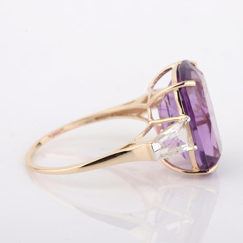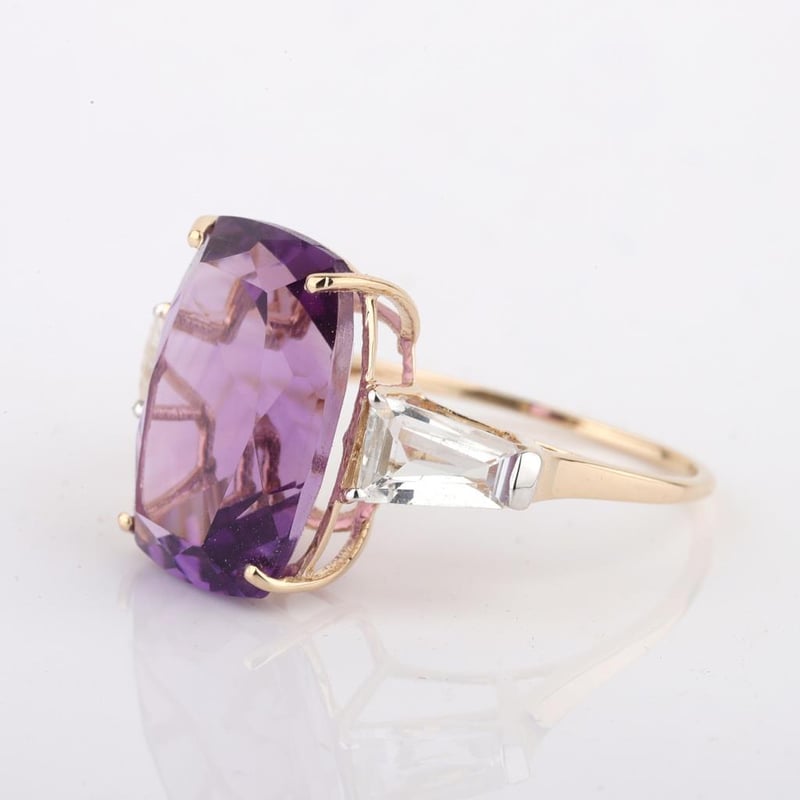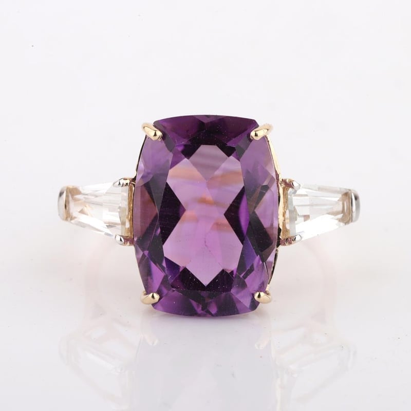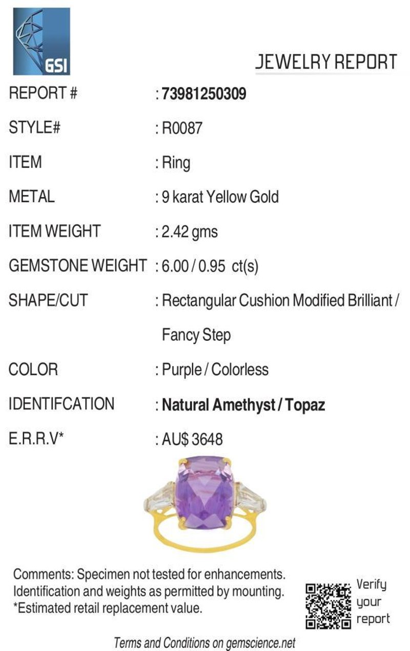 9CT YELLOW GOLD NATURAL AMETHYST / NATURAL WHITE TOPAZ RING WITH VALUATION Weight Of The Item: 2.42 GFineness Of Metal(S): Yellow Gold 9KtThe Ring Consists Of (1) Cushion Brilliant Natural Amethyst & (2) Baguette Brilliant Cut White Topaz.Antique StyleIdentification: Natural Amethyst / Natural White TopazColor: Purple / WhiteShape: Cushion Brilliant Cut / Baguette Faceted CutNo. Of Stone: 3Dimension: 14 Mm X 10 Mm X 8.4 MmWeight: 6 Carats / 0.95 CaratsCut: Very GoodCondition: Brand New (Unsold Jewellery Store Stock) Refer To Gemmologist Report For Further Grading Notes Accompanied By Gemmologist Report Issued By Gemological Science International (Gsi).Replacement Retail Value:$3648 Markings: 9ct Condition: Good - Refer Images 0488580+24