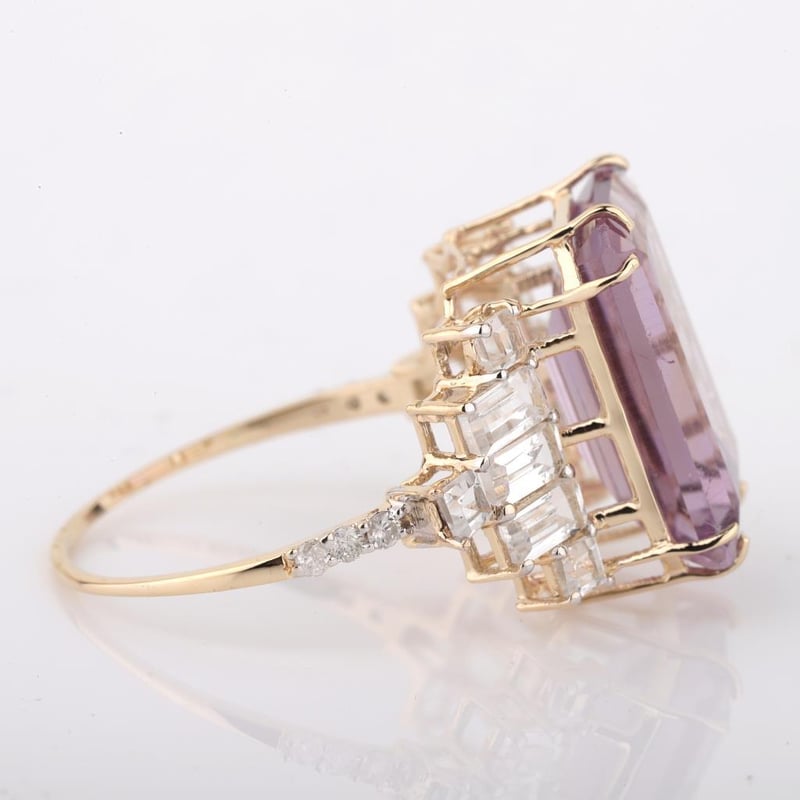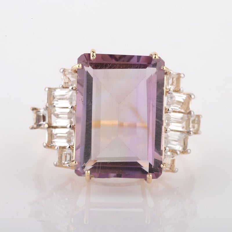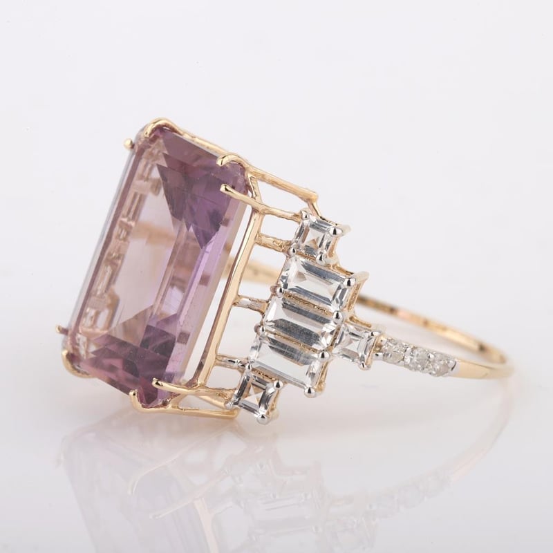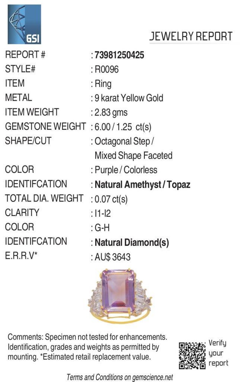 9CT YELLOW GOLD NATURAL AMETHYST / NATURAL WHITE TOPAZ & DIAMOND RING WITH VALUATION Weight Of The Item: 2.83 GFineness Of Metal(S): Yellow Gold 9KtThe Ring Consists Of (1) Octagon Step Natural Amethyst & (12) Octagon+Square Brilliant Cut White Topaz. Surrounding The Main Stones Are Round Brilliant Cut Natural Diamonds.Antique StyleIdentification: Natural Amethyst / Natural White TopazColor: Purple / WhiteShape: Octagon Step Cut / Octagon+Square Faceted CutNo. Of Stone: 13Dimension: 14 Mm X 10 Mm X 8.4 MmWeight: 6 Carats / 1.25 CaratsCut: Very GoodIdentification: Natural DiamondShape: Round Brilliant CutWeight: 0.07 CtsCut: ExcellentCondition: Brand New (Unsold Jewellery Store Stock) Refer To Gemmologist Report For Further Grading Notes Accompanied By Gemmologist Report Issued By Gemological Science International (Gsi).Replacement Retail Value:$3643 Markings: 9ct Condition: Good - Refer Images 0488580+46