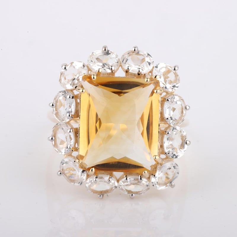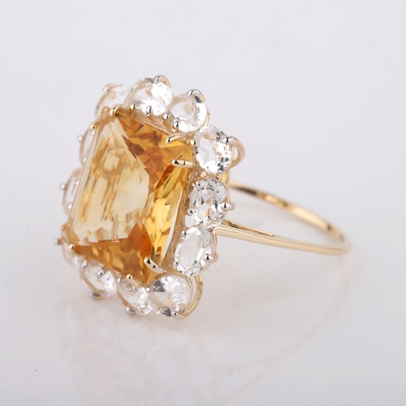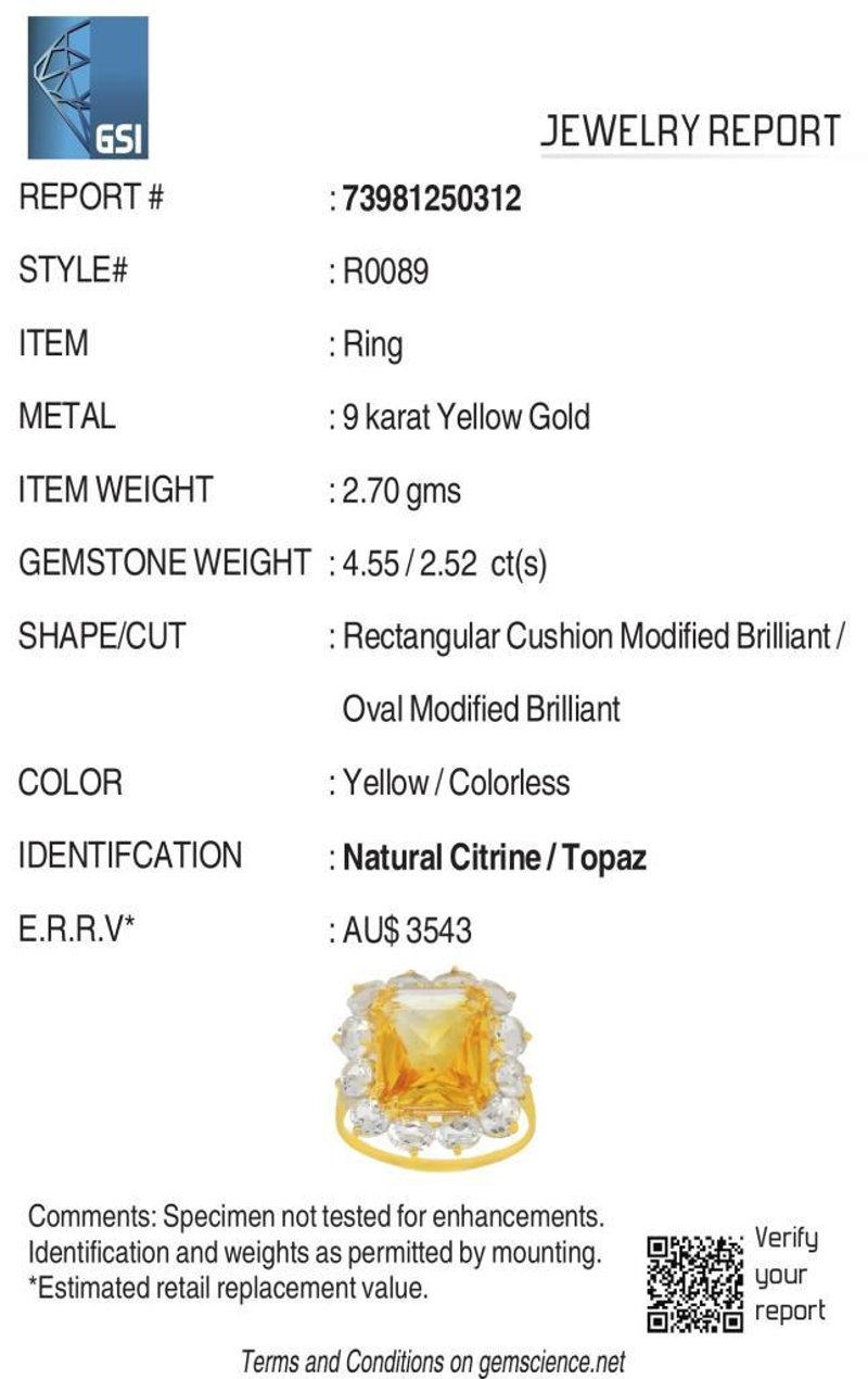 9CT YELLOW GOLD NATURAL CITRINE / NATURAL WHITE TOPAZ RING WITH VALUATION Weight Of The Item: 2.7 GFineness Of Metal(S): Yellow Gold 9KtThe Ring Consists Of (1) Octagon Step Natural Citrine & (12) Oval Brilliant Cut White Topaz.Antique StyleIdentification: Natural Citrine / Natural White TopazColor: Yellow / WhiteShape: Octagon Step Cut / Oval Faceted CutNo. Of Stone: 13Dimension: 12 Mm X 10 Mm X 7.2 MmWeight: 4.55 Carats / 2.52 CaratsCut: Very GoodCondition: Brand New (Unsold Jewellery Store Stock) Refer To Gemmologist Report For Further Grading Notes Accompanied By Gemmologist Report Issued By Gemological Science International (Gsi).Replacement Retail Value:$3543 Markings: 9ct Condition: Good - Refer Images 0488580+26