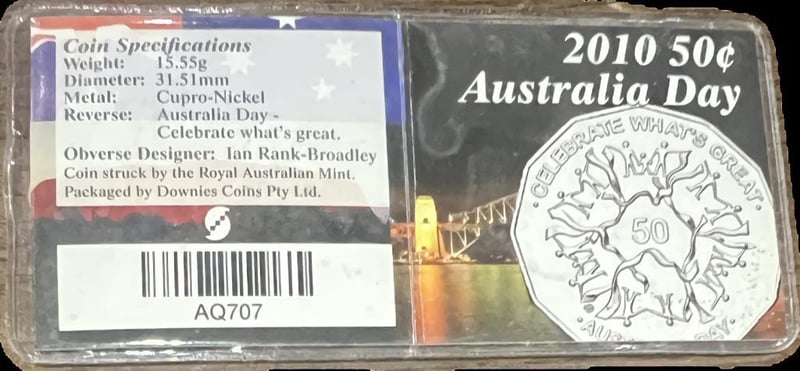 2010-50C AUSTRALIA DAY COIN IN DOWNIES CARD SCARCE 294167+15