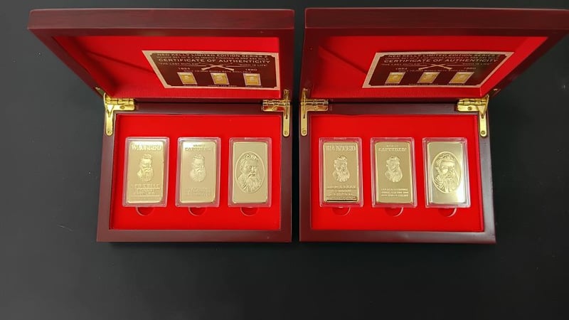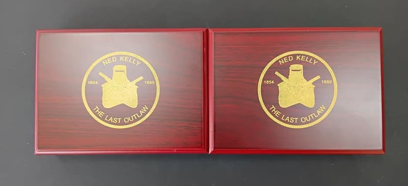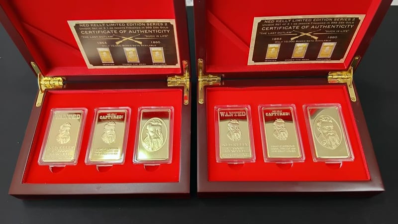 NED KELLY 2 X SET 1St Is 3 X 1 Troy Oz Finished In 999 24K Gold Limited Double Sided Plated With Images Of Th Kelly Gang, Other 3 X 1-Oz Kelly Gang Ingot, Each Series Finished In Silver Limited Plating Set, Limited Edition In A Wooden Display Box Great Gifts 11600+7