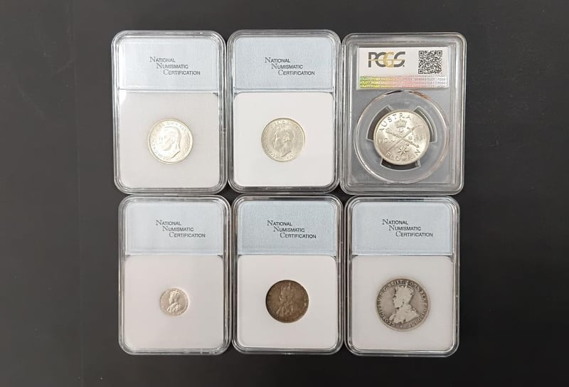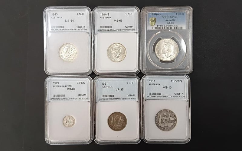 COLLECTION OF GRADED COINS 2 X Florins, 3 X Shillings, 1924 3Pence (Ms62) Various Grades Up To Ms66 11600+13