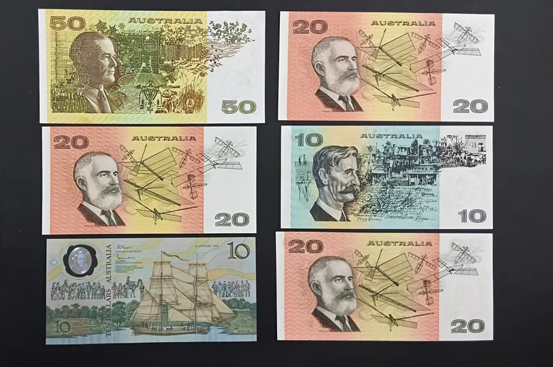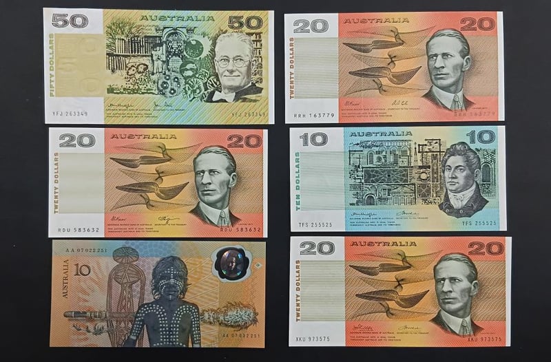COLLECTION OF AUSTRALIAN DECIMAL NOTES 1979 $50, 1976 $10+$20, 1988 $10, 1989 - 91 $20 Dollars Notes Ef To Unc 11600+16