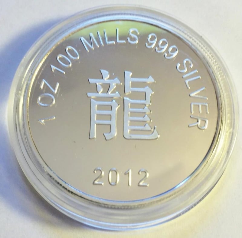 2012 1 OUNCE "YEAR OF THE DRAGON" COIN FINISHED IN 999 FINE SILVER IN ACRYLIC CAPSULE,