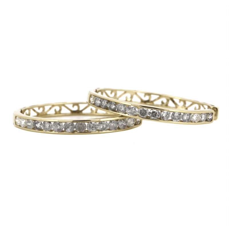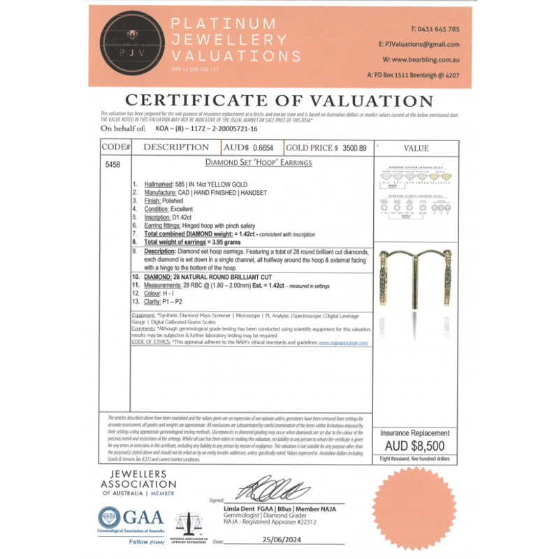 14K YELLOW GOLD, 1.42CT TDW DIAMOND, HOOP EARRINGS. The Hoops Feature, 28 Round Brilliant Cut, Diamonds (1.42Ct Tdw, H-I Colour, P1-P2 Clarity), Channel Set. The Earrings Have Hinged Hoop With Pinch Safety. Valuations Provided by an Independent Third-Party Professional Not Directly Associated With Lloyds Auctions at AUD $$8,500.00This valuation has been conducted by an independent third-party professional. The valuation amount is an assessment by the issuing valuer and does not reflect the auction value of the item. Any inquiries regarding the valuation should be directed to the issuing valuer (refer to contact details on the certificate), as Lloyds Auctions has no affiliation or influence over the valuation, the valuer, or the stated amount. Condition: Good - Refer Images 0645971+48