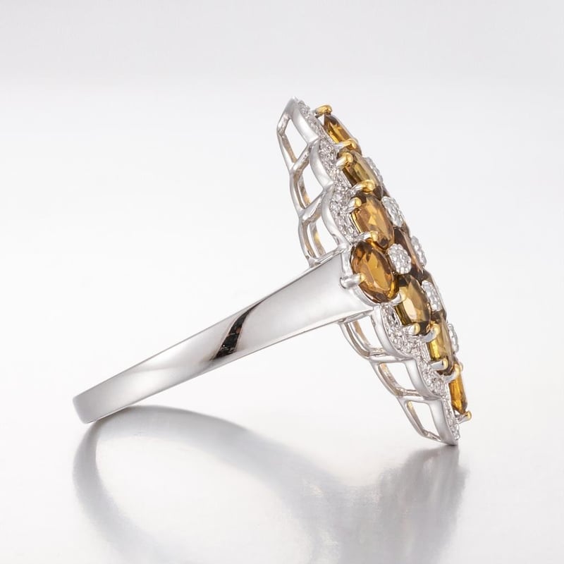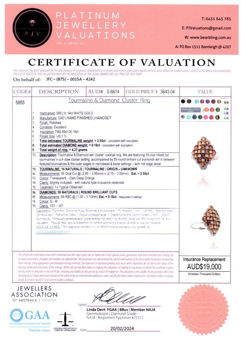 14CT WHITE GOLD TOURMALINE AND DIAMOND CLUSTER RING Featuring Centre, 16 Oval Cut, Dark Deep Orange Tourmalines (2.55Ct Tsw, Slightly Included), Bead Set In Yellow Gold, With 59 Round Brilliant Cut Diamonds (0.18Ct Tdw, G-M Colour, Vs1-Si1 Clarity), Claw Set. Ring Size O. Valuations Provided by an Independent Third-Party Professional Not Directly Associated With Lloyds Auctions at AUD $19000This valuation has been conducted by an independent third-party professional. The valuation amount is an assessment by the issuing valuer and does not reflect the auction value of the item. Any inquiries regarding the valuation should be directed to the issuing valuer (refer to contact details on the certificate), as Lloyds Auctions has no affiliation or influence over the valuation, the valuer, or the stated amount. Condition: Good - Refer Images 0584528+2180