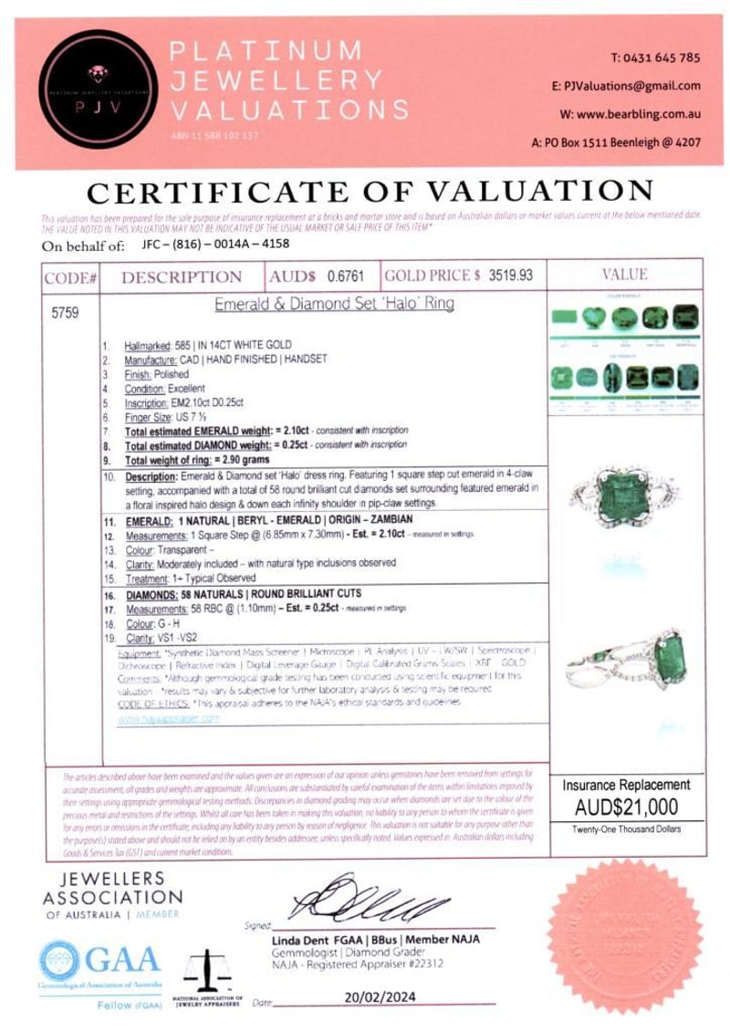 14CT WHITE GOLD ZAMBIAN EMERALD AND DIAMOND DRESS RING, Featuring Centre, One Square Step Cut, Green Zambian Emerald (2.10Ct, Moderately Included), Claw Set, With 58 Round Brilliant Cut Diamonds (0.25Ct Tdw, G-H Colour, Vs1-Vs2 Clarity), Bead Set. Ring Size O. Valuations Provided by an Independent Third-Party Professional Not Directly Associated With Lloyds Auctions at AUD $21000This valuation has been conducted by an independent third-party professional. The valuation amount is an assessment by the issuing valuer and does not reflect the auction value of the item. Any inquiries regarding the valuation should be directed to the issuing valuer (refer to contact details on the certificate), as Lloyds Auctions has no affiliation or influence over the valuation, the valuer, or the stated amount. Condition: Good - Refer Images 0584528+2181