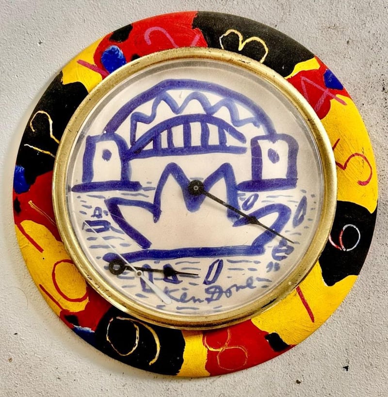 KEN DONEAcrylic On A Circular Timber Frame And Acrylic On Paper In The Form Of A Clock Title: Untitled Condition: Good - Refer Images 25Cm Diameter. The Clock No Longer Works. Bought In Charity Auction At Brisbane City Hall Approx. 1995. Ken Done (B. 1940), Painter, Studied At East Sydney Tech Before Becoming An Advertising Graphic Designer. He Gave Up Work To Paint Full Time In 1980. Soon, His Stylised, Colourful Representations Of Sydney'S Beaches, Harbour, Animals And Flowers Found Their Way Onto Placemats, T-Shirts, Bibs, Swimwear, Sheets, Mugs And Vases. In 1987, When Ellis Took This Photograph For Playboy, Done Had An Annual Turnover Of More Than $4 Million. Ellis Spent Time With Him At His Studio On The Water At Chinaman'S Beach In Middle Harbour, Finding Him To Have 'A Strong Sense Of Himself As Successful Designer, Entrepreneur And Celebrity [But With] A Humble Side To Him That Keeps Things Well In Perspective And Will Not Allow Him To Be Seduced By Success.' Done Recently Told George Negus That Sneers At His 'Commercial' Art By Critics And Other Artists Worried Him - 'I'D Be Tougher Than I Really Am If I Told You That It Didn'T Hurt Sometimes' - But His Business Has Endured, And His Paintings Still Sell Well, Particularly In The Uk And Japan. Done Was Named Australia'S Father Of The Year In 1989 And Mosman Citizen Of The Year In 1993 And He Was Australia'S Goodwill Ambassador To Unicef In 1993. A Large Exhibition Of His Art From The 1980S Toured New South Wales Between 1991 And 1993. The Powerhouse Museum, The Restaurant Of Which Was Decorated By Done In The Early 1990S, Held A Large Solo Exhibition Of His Work In 1994-1995. 584458+40