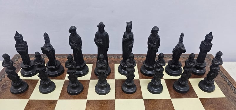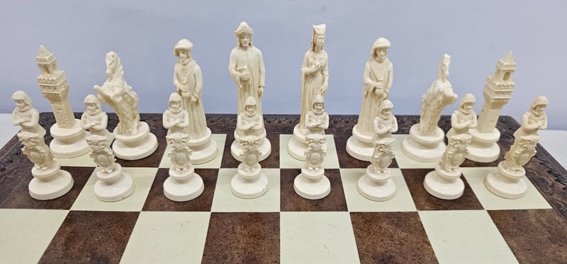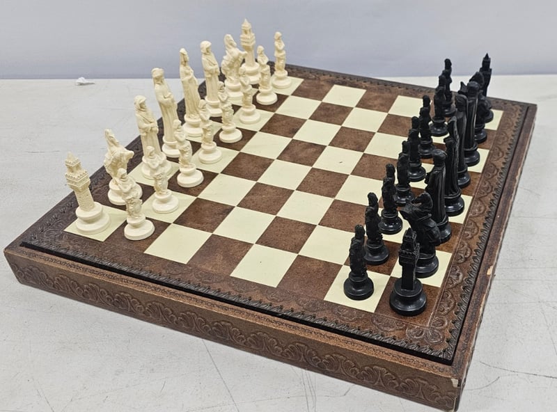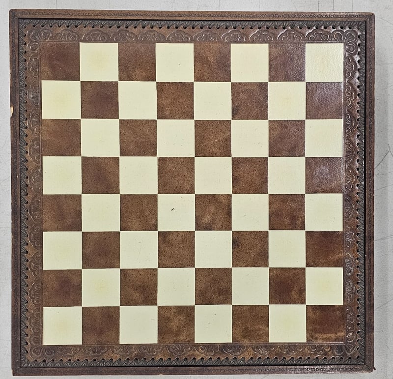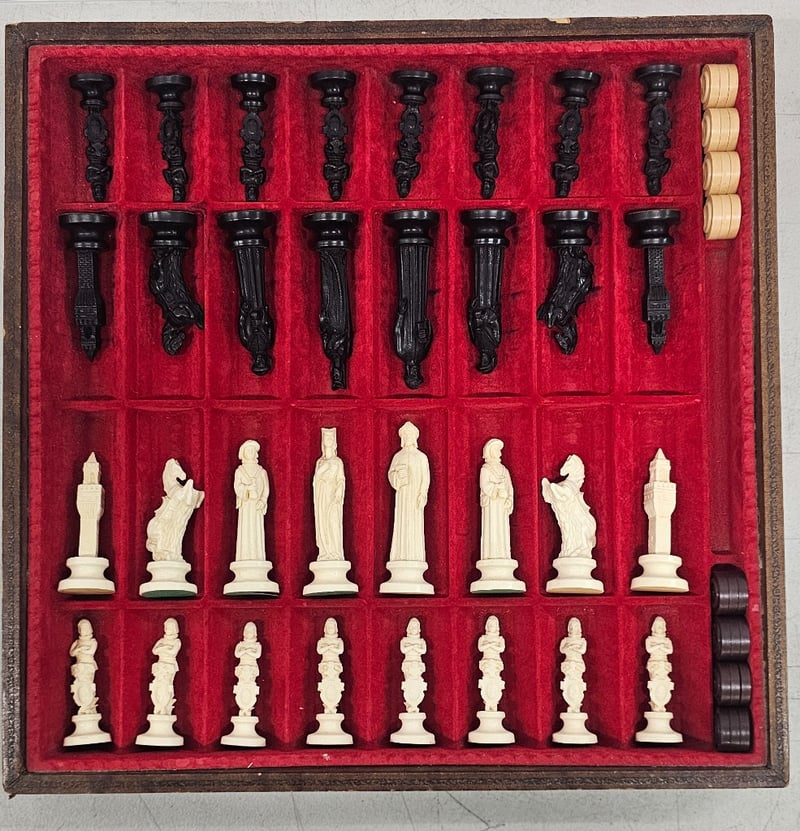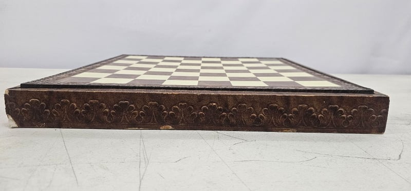 ORNATE WOODEN CHESS AND CHECKERS SET WITH BOARD. BOARD DOUBLES AS STORAGE CASE Item Size: Height: 6cm, Width: 49cm, Depth: 49cm, Weight: 1.5Kg Condition: Good - Refer To Images 587934+7