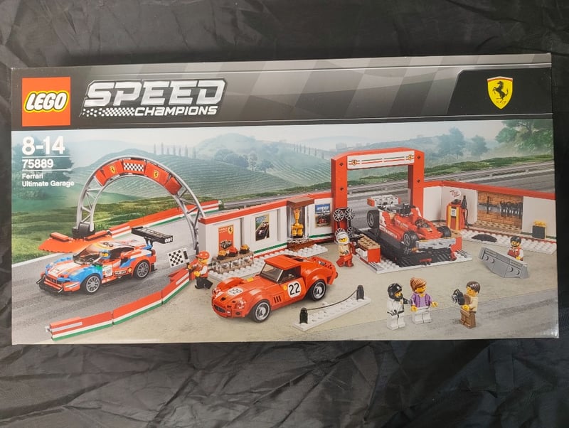 Lego Speed Champions Ferrari Ultimate Garage (Set 75889) Featuring A Comprehensive Racing Facility With Loop Track, Service Garage, Pit Area, And Three Ferrari Vehicles Including Race Cars Numbered 22 And 27. Includes Minifigures And Detailed Track Elements. Age Range 8-14 Years.