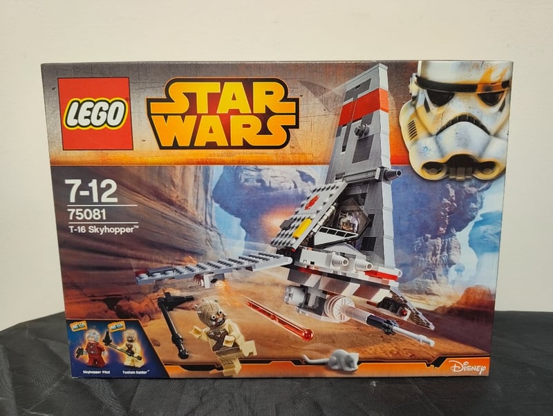 Vintage Lego Star Wars T-16 Skyhopper Construction Set (75081) Featuring Detailed Spacecraft Model With Opening Cockpit, Dual Minifigures (Skyhopper Pilot And Tusken Raider), Accessories Including Staff And Blaster, And Desert Terrain Base. Original Box Shows Original Artwork And Instructions. Suitable For Ages 7-12. Collectible From Star Wars Expanded Universe Theme Line.