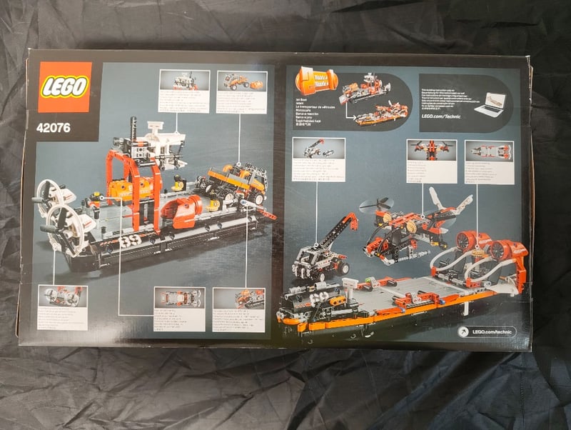 Lego Technic 42076 Hovercraft Construction Set Featuring An Orange And Yellow Motorized Hovercraft With Functional Propeller And Rotating Fan Mechanisms. Includes Additional Buildable Vehicles And Components, Multiple Instruction Booklets, And Demonstrates Advanced Mechanical Engineering Principles. Ages 9-16. Complete With Original Packaging Displaying Detailed Product Imagery And Specifications.