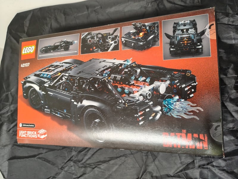Lego Technic Set 42127 Featuring The Batman Batmobile From The 2022 Film. Age 10+. Features Light Brick Functions, Detailed Mechanical Engineering With Exposed Engine Components, Opening Doors, And Authentic Design Replicating The Cinematic Vehicle. Includes Batteries. Box Displays Comprehensive Construction Imagery Showing Intricate Internal Mechanisms And Finished Model From Multiple Angles.