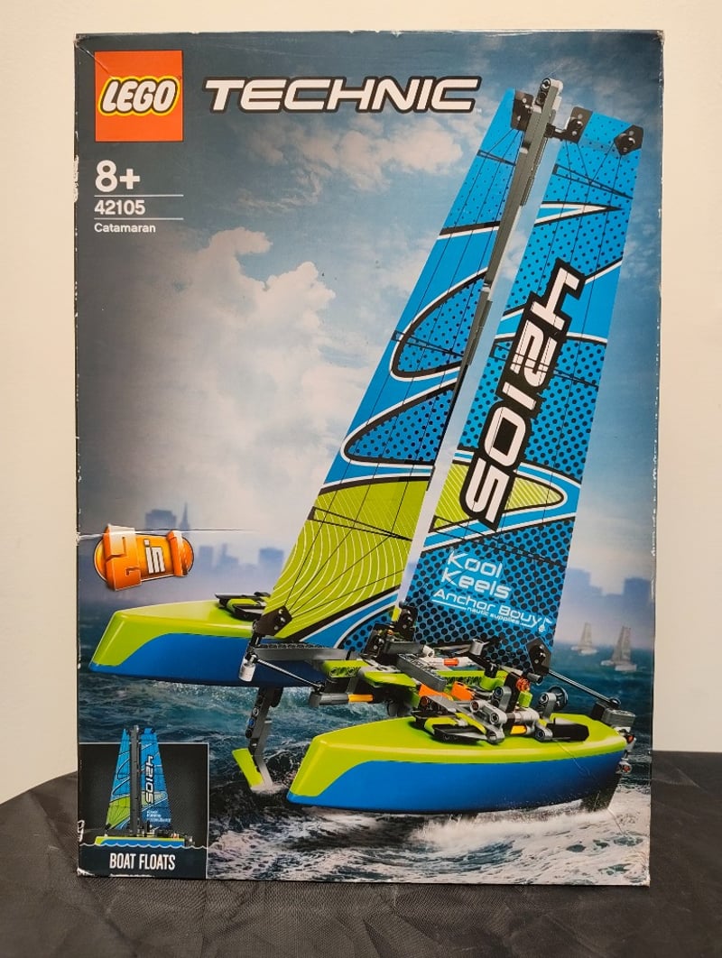 Lego Technic Catamaran (Set 42105) Featuring A Dual-Hulled Watercraft With Motorized Sail Mechanism, Adjustable Blue And Lime-Green Sails, Functional Rudder System, And Detachable Minifigure With Power Boat. This Advanced Building Set For Ages 8+ Includes Authentic Nautical Engineering With Working Propulsion Systems And Transformable Boat Floats Configuration. The Set Demonstrates Technical Construction Principles Through Its Articulated Sail Rigging And Dual-Hull Design Typical Of High-Perform