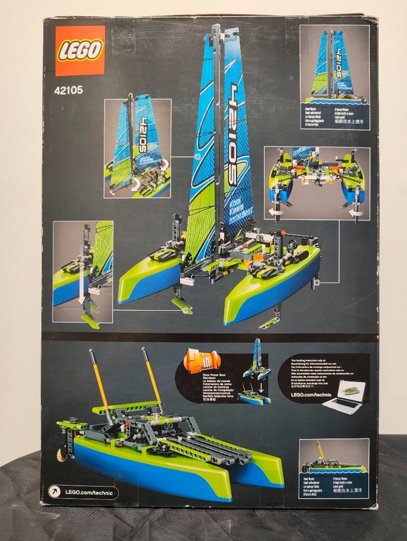 Lego Technic Catamaran (Set 42105) Featuring A Motorised Dual-Hull Sailboat With Poseable Rigging, Functional Steering Mechanism, And Detachable Outrigger Stabilisers. Complete With Instruction Manual And Original Packaging. Suitable For Ages 8+.