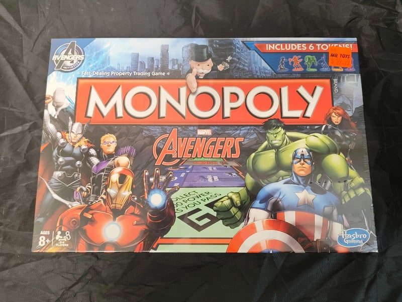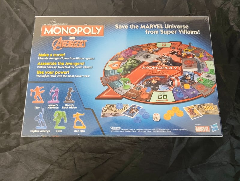 Sealed Marvel Avengers-Themed Monopoly Board Game By Hasbro Gaming Featuring Fast-Dealing Property Trading Mechanics. Includes Six Collectible Character Tokens (Thor, Hawkeye, Black Widow, Captain America, Hulk, Iron Man). Game Objective Involves Liberating Avengers Tower From Ultron'S Grasp, Assembling Superhero Teams For Villain Defeats, And Utilizing Individual Character Powers To Achieve Victory. Components Include Themed Currency, Location Markers, Avengers Recruitment Cards, And Character-