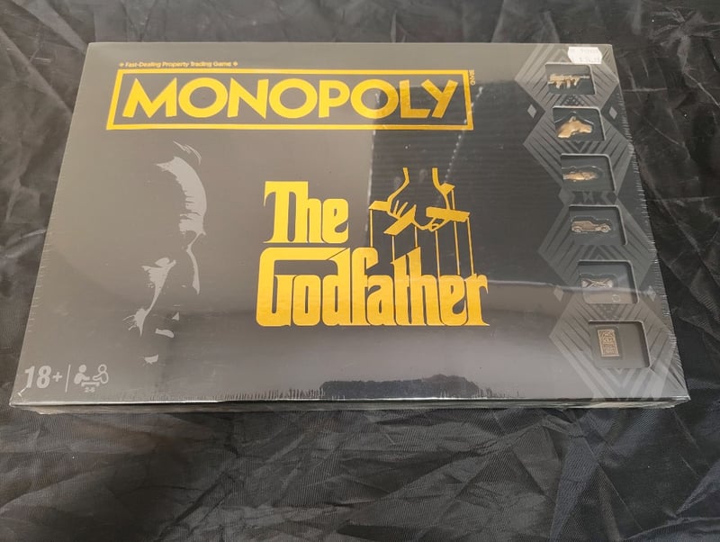 Sealed Monopoly The Godfather Edition Board Game Featuring Themed Property Cards, Six Designer Tokens Including The Iconic Gun And Cannoli, And Game Board Depicting Locations From The Acclaimed Film. Includes Original Packaging With Classic Film Imagery And Branded Hasbro Production Details.