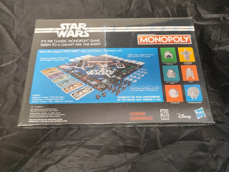 Star Wars Monopoly 40Th Anniversary Special Edition By Hasbro. Features Classic 1977 Film Imagery With Custom Game Pieces Including Iconic Spacecraft And Characters. Includes Game Board, Property Cards, Currency, Dice, And Six Collectible Metal Tokens Representing Star Wars Vessels And Droids. Sealed Original Packaging In Near-Mint Condition Celebrating Four Decades Of The Original Film.