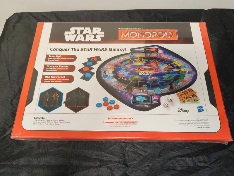 Star Wars-Themed Monopoly Board Game By Hasbro/Disney Featuring A Galaxy Conquest Gameplay Mechanic. The Set Includes A Custom-Designed Game Board With Star Wars Iconography, Character Tokens Representing Iconic Figures From The Franchise, Property Cards Themed To Star Wars Planets, Two Six-Sided Dice, Symbol Cards, And Instruction Materials. Packaged In Original Retail Box With Window Display Showing Game Components. Designed For Ages 8 And Up, Supporting 2-8 Players. Game Mechanics Incorporate