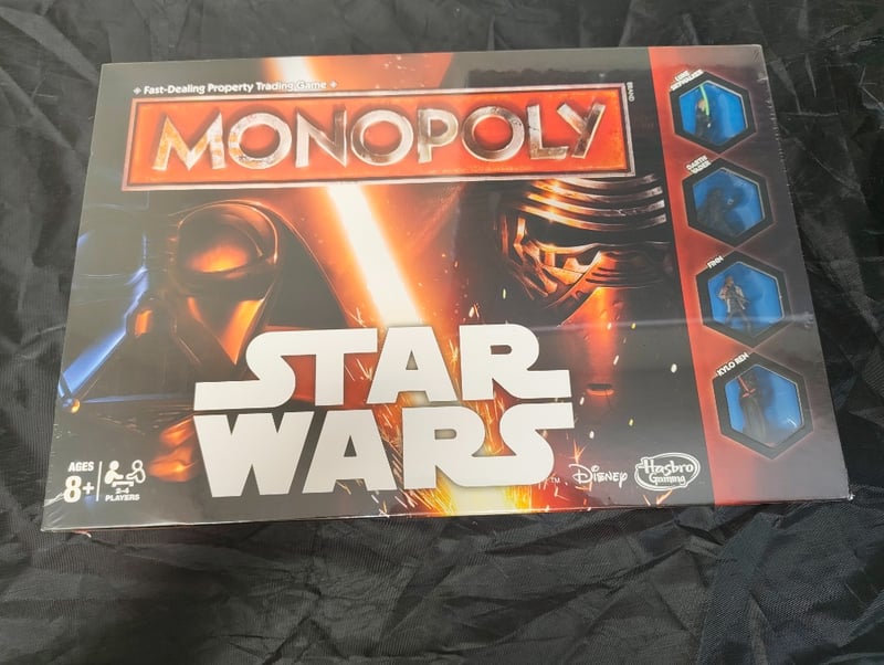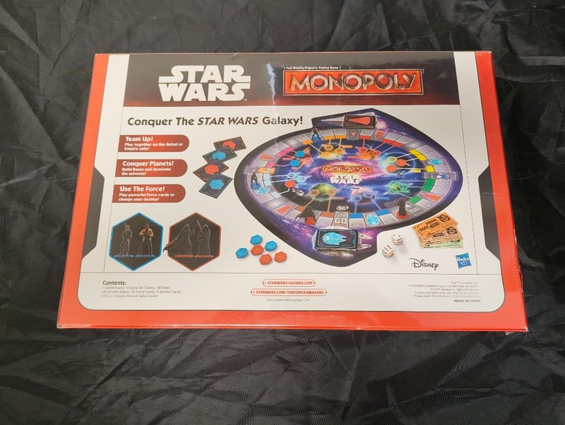 STAR WARS MONOPOLY BOARD GAME BY HASBROStar Wars-Themed Monopoly Board Game By Hasbro/Disney Featuring Galactic Conquest Gameplay. Players Team Up To Conquer Planets And Dominate The Star Wars Galaxy Using "The Force" Mechanics. Includes Character Tokens, Property Cards, Game Board With Illuminated Design, Dice, And Game Guide. Aged 8+ Players. Fast-Dealing Property Trading Game Mechanics Adapted For Star Wars Universe.Condition: Good - Refer To Images584525+190