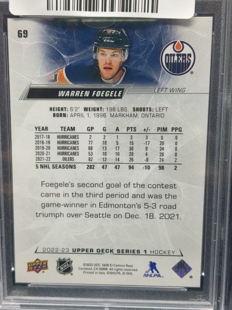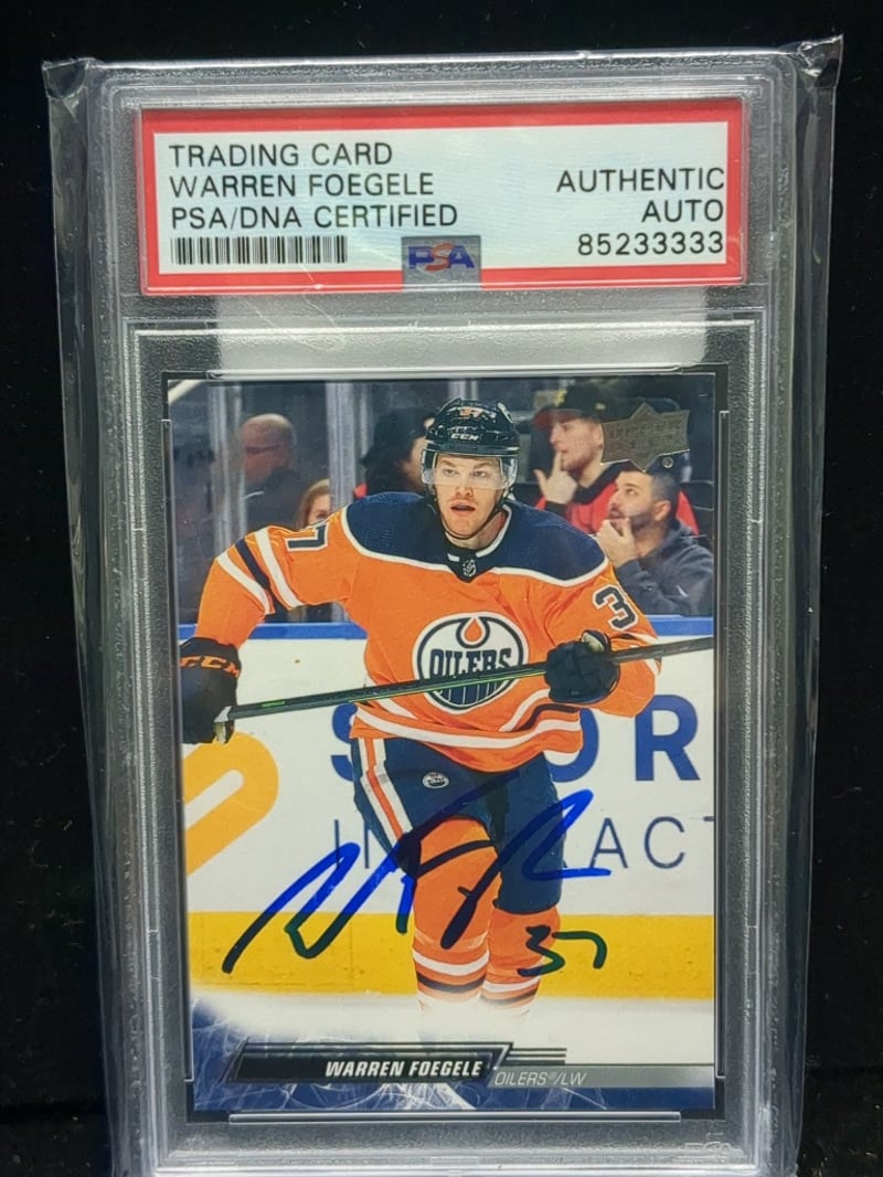 Psa Certified Authentic Autographed Trading Card Featuring Edmonton Oilers Left Wing Warren Foegele From The 2022-23 Upper Deck Series 1 Hockey Set. Card Displays Player Action Photograph In Orange And Navy Oilers Uniform With Authentic Blue Ink Autograph Across The Card Face. Psa Certification Number 85233333 Validates Signature Authenticity. Card Back Includes Player Statistics Spanning Five Nhl Seasons (2017-2022), Biographical Data Noting Birth Date Of 01/04/1996 In Markham, Ontario, And Car