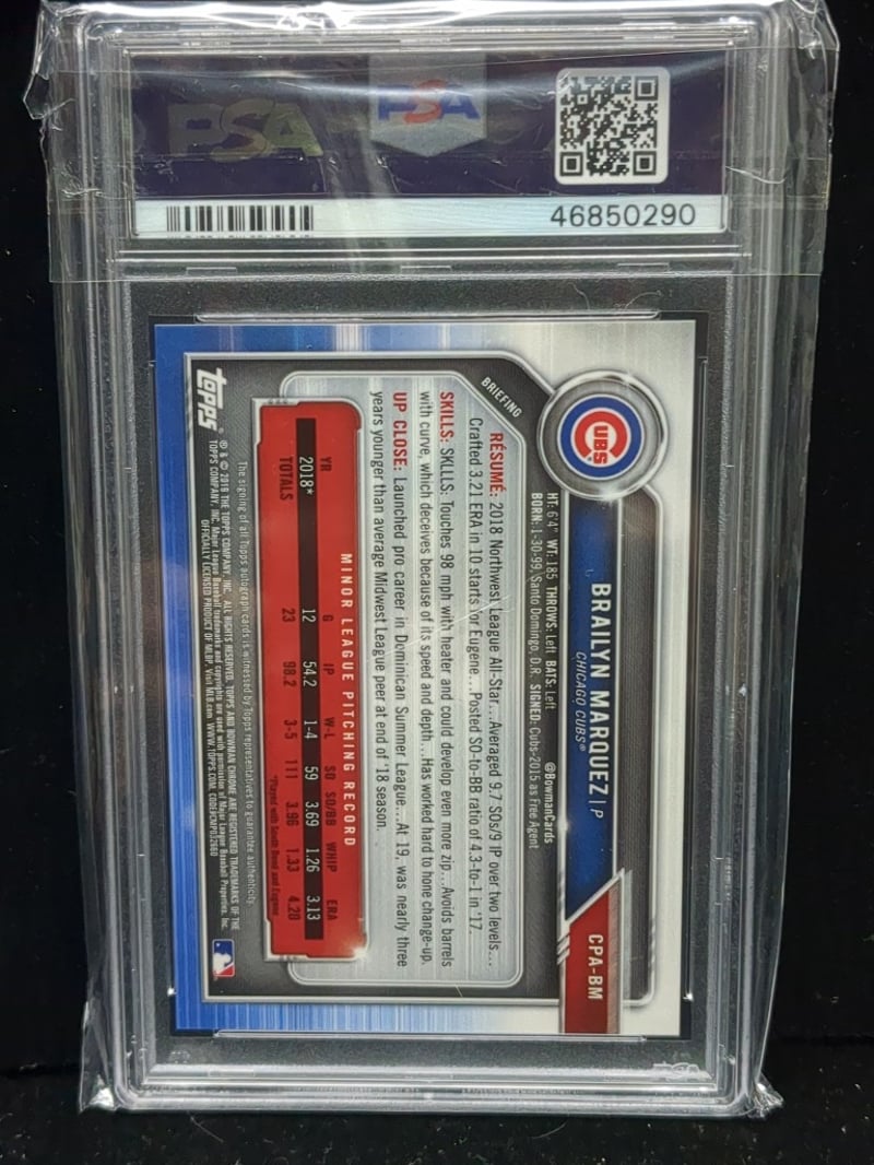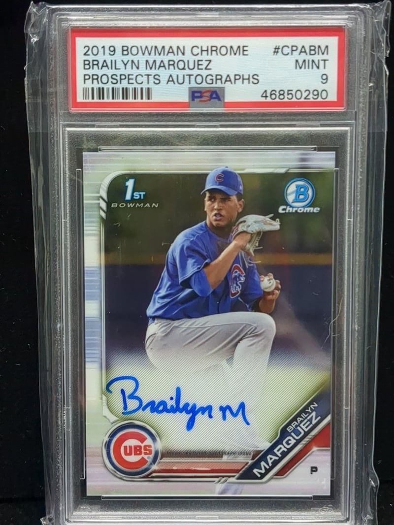 2019 BOWMAN CHROME BRAILYN MARQUEZ PROSPECTS AUTOGRAPHS PSA 9 MINT BASEBALL CARD 2019 Bowman Chrome #Cpabm Brailyn Marquez Autographed Rookie Prospects Card Graded Psa Mint 9. Features Blue Chrome Design With Cubs Uniform, Authenticated Autograph, And Protective Psa Encasement. Card Includes Barcode 46850290 And Displays Reverse Biographical Details. Condition: Good - Refer To Images 582933+22
