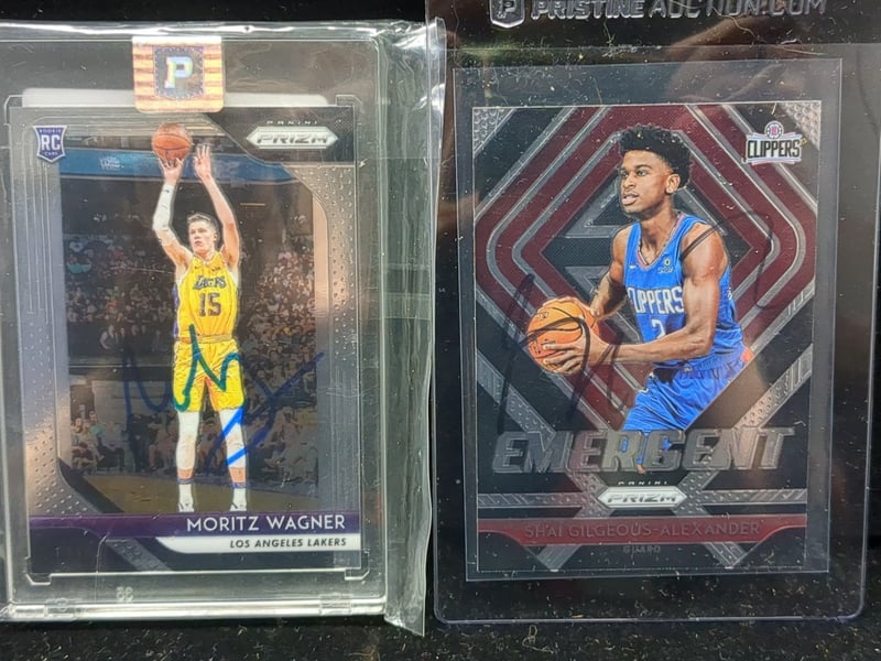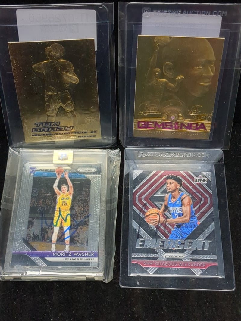 A Curated Collection Of Four Professionally Graded And Signed Basketball Trading Cards Featuring Nba Players. Includes A 2011 Panini Prizm Moritz Wagner (Los Angeles Lakers) Autographed Card In Yellow Jersey, A 2019 Panini Prizm Emergent Shai Gilgeous-Alexander (La Clippers) Card, A Gold-Embossed Tgm Brady Rookie Card With Facsimile Signature, And A 23K Gold-Plated Michael Jordan Emerinea Card. The Signed Cards Showcase Authentic Autographs And Premium Presentation Slabs With Protective Grading