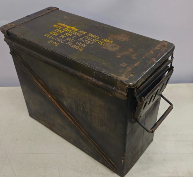Vintage Military-Issue Steel Ammunition Box. Metal Handles And Latching Mechanism Intact. Shows Patina And Rust Consistent With Age And Storage.