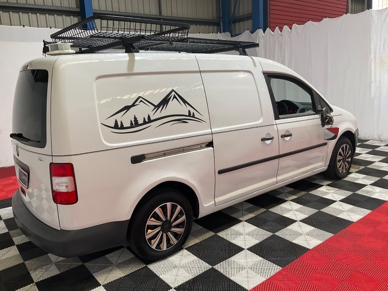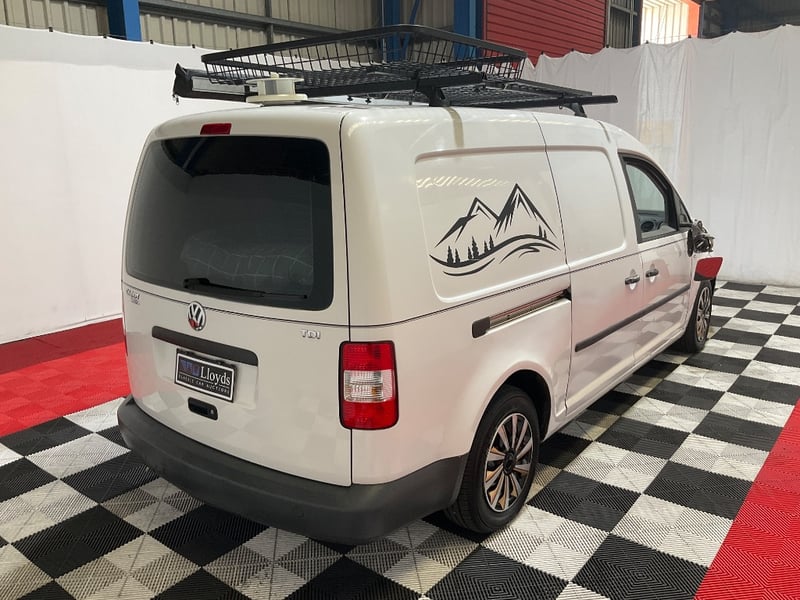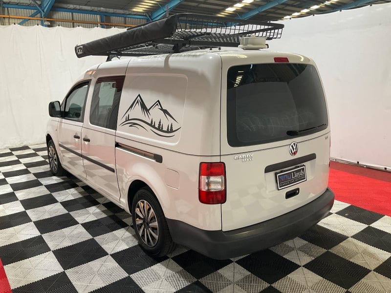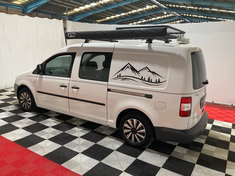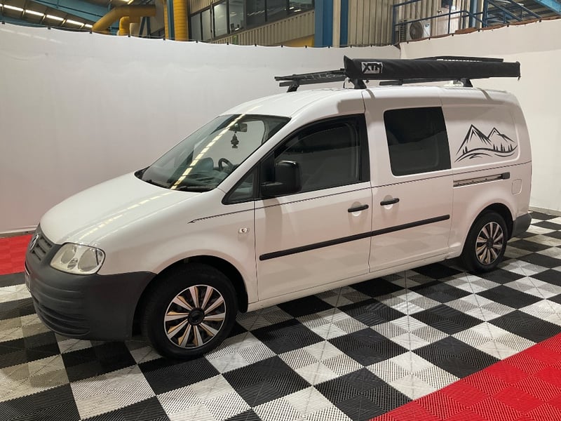 The Volkswagen Caddy Maxi TDI is the practical choice for compact adventure touring. Built on the long-wheelbase commercial van platform, this 2KN-generation Caddy Maxi offers a genuine rear load space paired with a frugal 1.9-litre TDI diesel engine - one of the best engines for long-haul touring thanks to its strong low-end torque and excellent fuel economy. This white example has been set up as a capable overnight micro-camper with real-brand accessories throughout.
