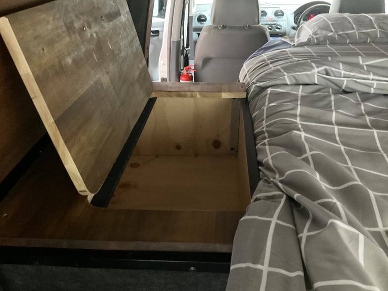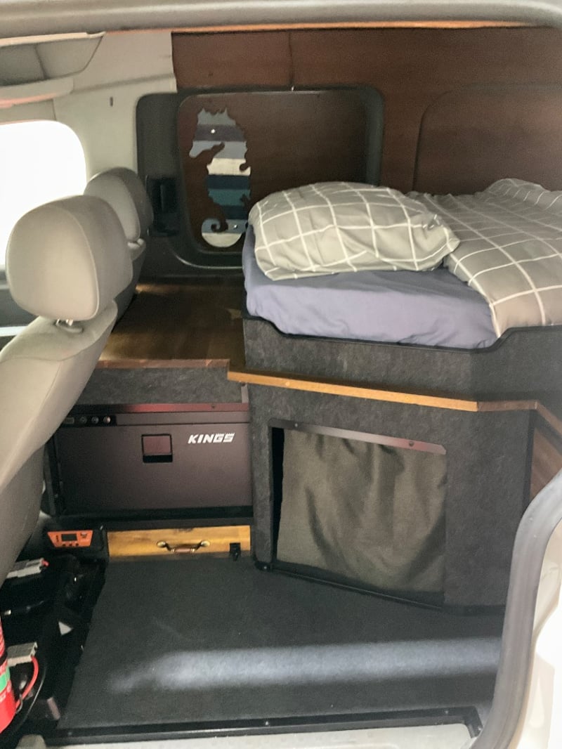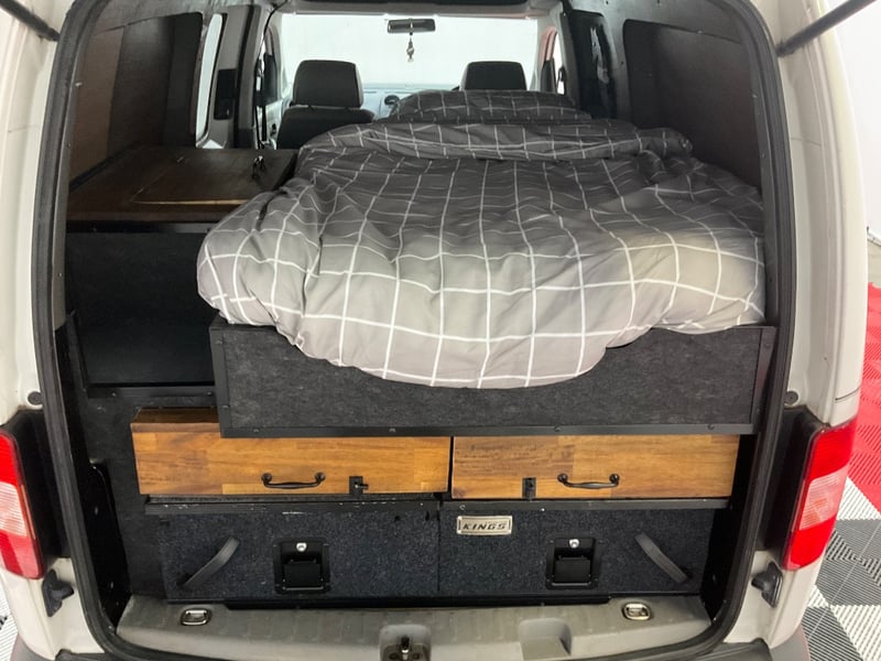 The price guide of $2,250 to $4,250 is noted as being for the unmodified vehicle. A VW Caddy Maxi TDI diesel with a Kings-equipped conversion, awning, roof rack, and auxiliary power system represents genuine value. Comparable Caddy micro-camper builds on the private market start from $8,000 and up. The Kings fridge, drawer system, and auxiliary battery alone carry significant replacement cost.