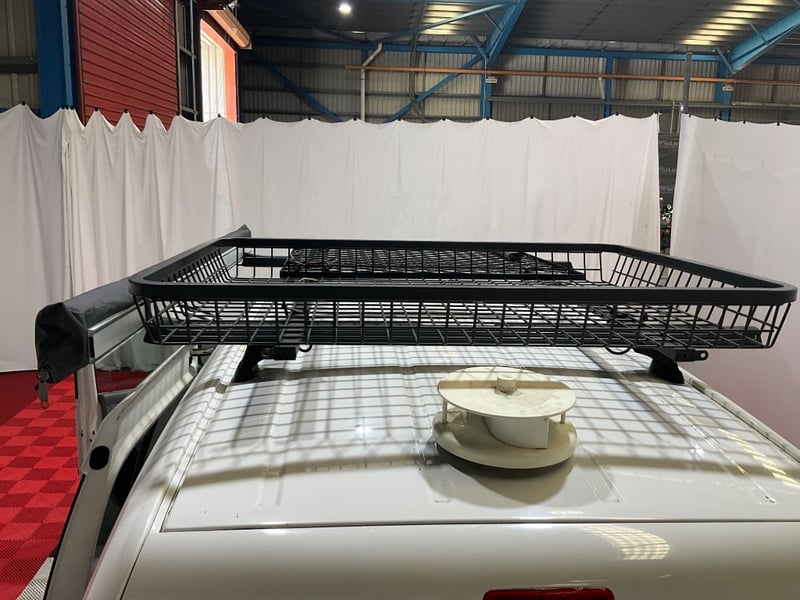 The exterior presents in white with minor marks and some paint fade in areas, consistent with a working van at this age and mileage. Aftermarket multi-spoke alloy wheels are fitted. The roof carries a full-length steel mesh cargo basket with a roll-up side awning mounted to the rack system. A mushroom-style ventilation vent is installed on the roof for interior airflow. The rear load area has been converted into a practical overnight setup: a raised sleeping platform spans the full cargo width with a lift-up lid revealing a large storage area underneath, and a Kings dual-drawer system sits in the lower tier with carpet-lined interiors and locking latches. A Kings top-opening 12V compressor fridge/freezer is mounted on a slide-out frame for easy access. An auxiliary battery and charge management system provides independent 12V house power, complete with Anderson plug connectors and solar charge controller. A slide-out butane hotplate extends from the rear for outside cooking. Timber flooring and wall cladding, interior shelving, and a small fire extinguisher complete the fit-out.