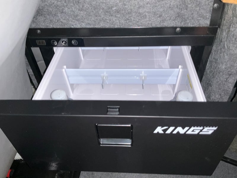 * Kings top-opening 12V compressor fridge/freezer (slide-out frame mounted)