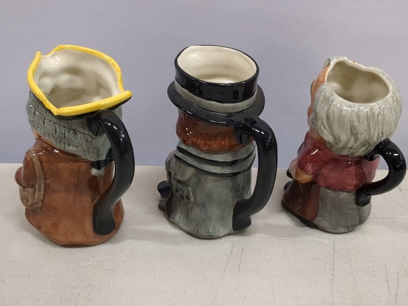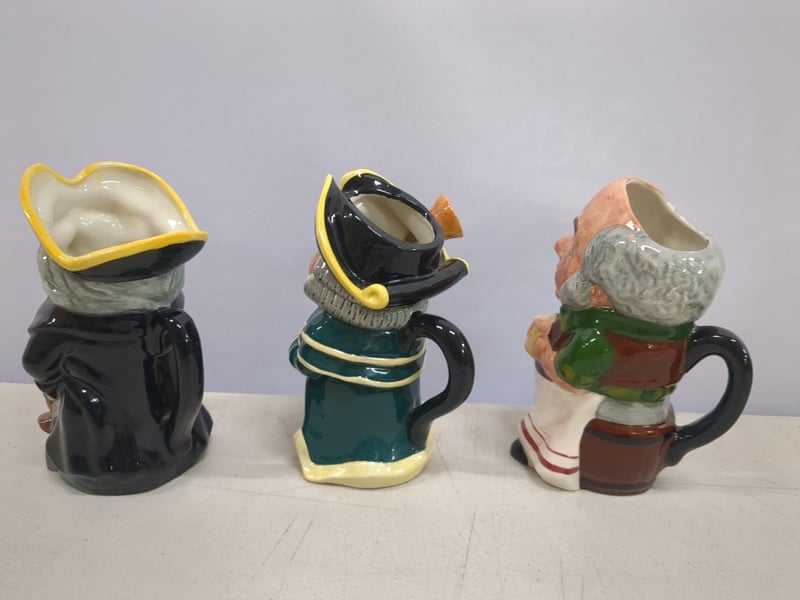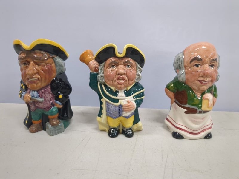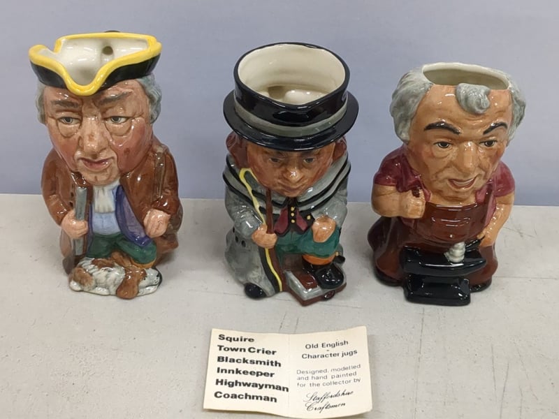 SET OF SIX OLD ENGLISH CHARACTER JUGS BY STAFFORDSHIRE MANORItem Size: Height: 15cm, Width: 8cm, Depth: 8cm, Weight: 0.3KgA Charming Collection Of Six Hand-Painted Ceramic Character Jugs Depicting Traditional Old English Figures Including Squire, Town Crier, Blacksmith, Innkeeper, Highwayman, And Coachman. Each Jug Features A Distinctive Tricorn Or Period Hat Forming The Spout, With Cream-Coloured Interior Glazing And Yellow Trim Detailing. Hand-Modelled Faces Display Individual Character With Expressive Features. Impressed Base Mark Reads "Staffordshire Character Jugs By Manor" With A Manor House Illustration. DesCondition: Good - Refer To Images582936+1