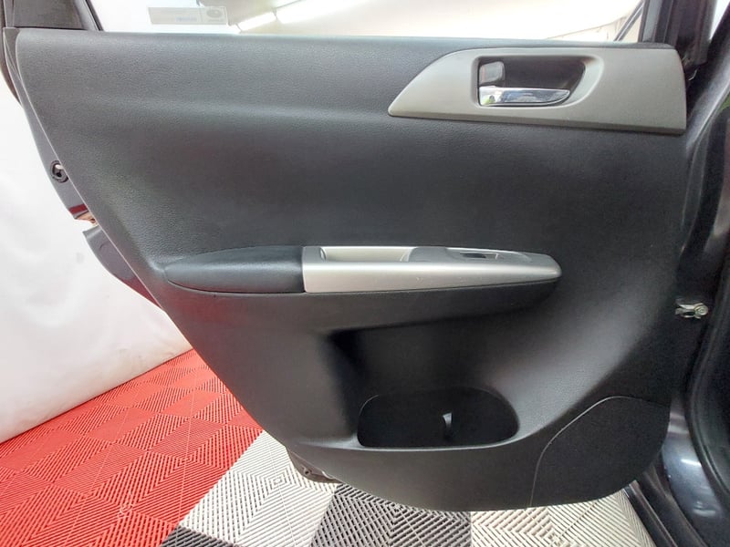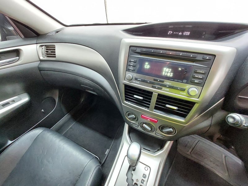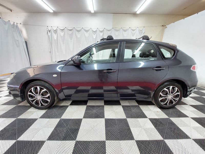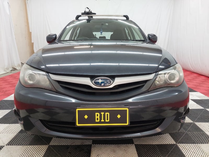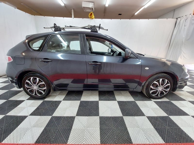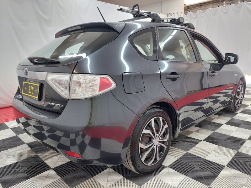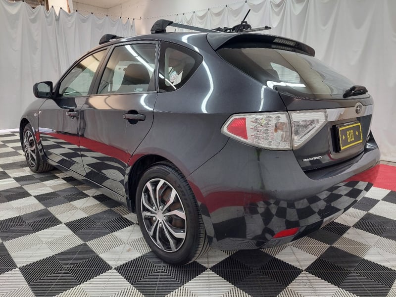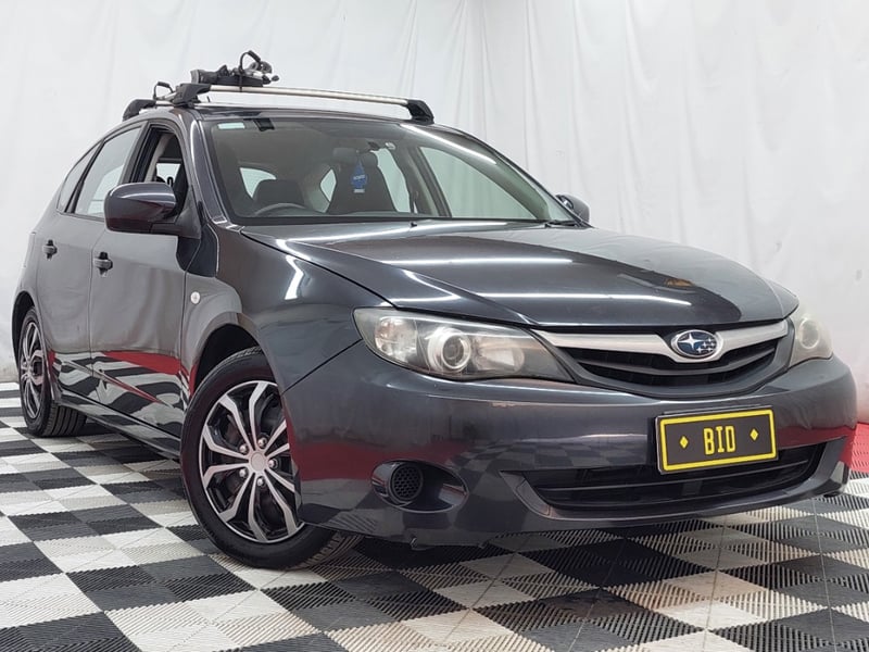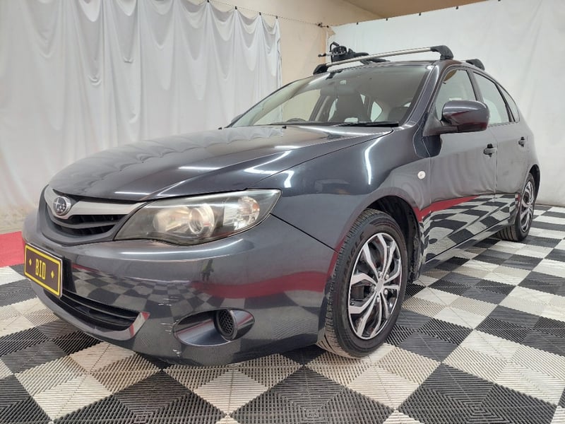 2010 Subaru Impreza G3 four-door hatchback finished in grey with distinctive red accent stripe. This all-wheel-drive compact hatchback features a 2.0-litre naturally aspirated four-cylinder petrol engine paired with a four-speed automatic transmission. The vehicle displays 245,627 kilometres on the odometer and comes equipped with roof-mounted Thule bicycle carriers. The interior presents black leather upholstery with grey trim accents, manual climate control, and a CD/MP3 compatible audio system. Documentation includes owner's manuals and service logbook with maintenance records. The vehicle is presented with original Subaru key fob. Rust corrosion on lower door trim panels, surface rust on door edge seals, minor paint scratches on driver side door handle area, wear marks on leather seat bolsters, scuff marks on interior door panels, minor surface corrosion visible on undercarriage components, light oxidation on exterior trim, worn seat leather with visible creasing, minor dents on rear bumper, scratches on rear reflector lens.. Inspection recommended.