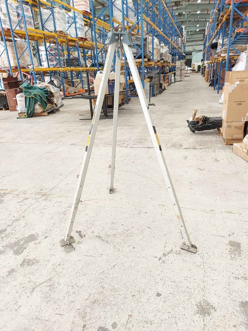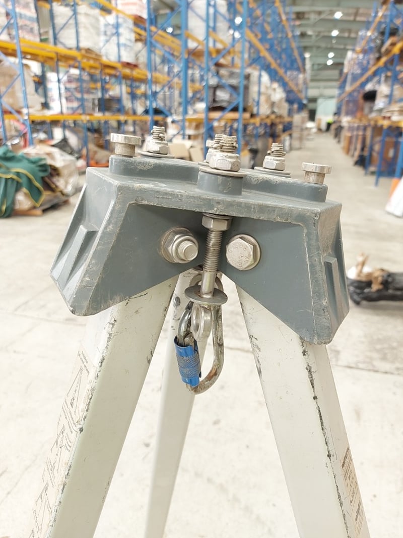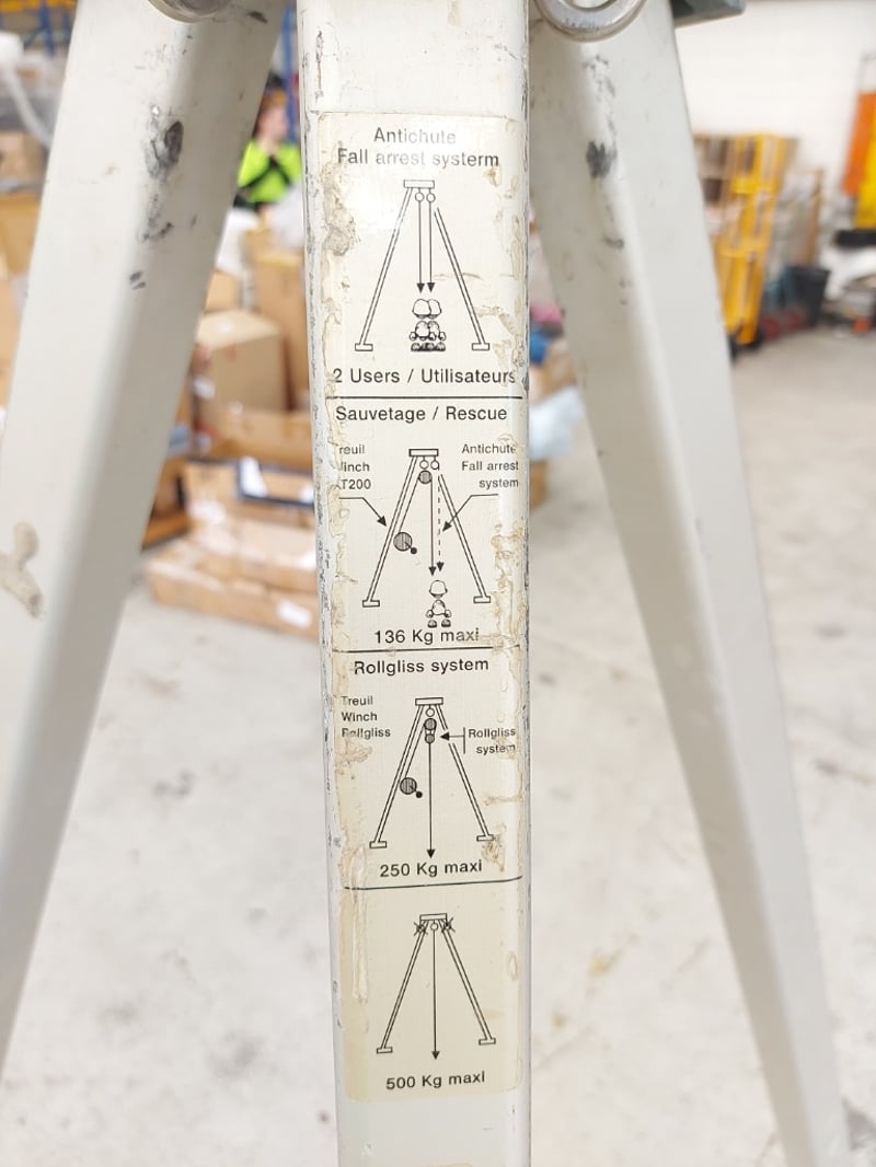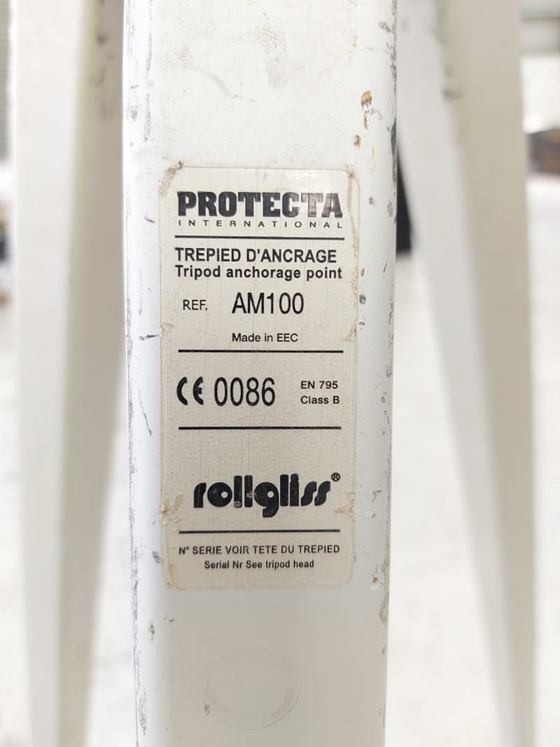 Protecta / Rollgliss Tripod Anchorage Point – Model AM100. Capacity: • Fall arrest / rescue: up to 136 kg (2 users) • Rollgliss winch system: up to 250 kg • Static load capacity: up to 500 kg • Tripod anchorage point with adjustable legs • Compatible with winch and self-retracting lifeline systems Note: Signs of cosmetic marks, scratches and label wear from normal industrial use.