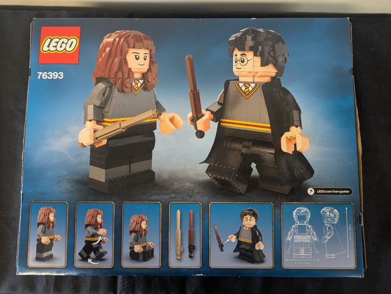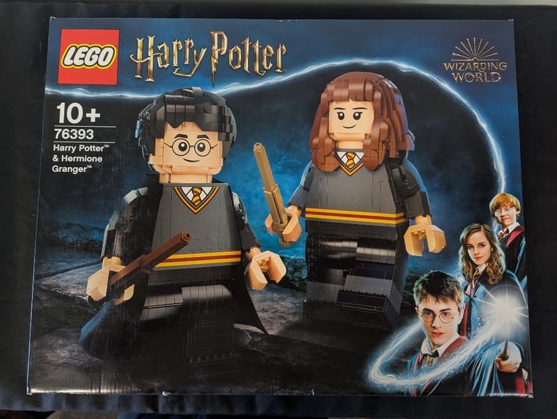 Lego Harry Potter & Hermione Granger Set 76393 Featuring Two Highly Detailed Minifigure Representations Of The Iconic Characters In Hogwarts School Robes With House Colours. Set Includes Dual Wand Accessories, Articulated Limbs, And Printed Facial Features. Original Packaging With Wizarding World Branding Intact. Age Rating 10+. Contains Construction Blueprints And Assembly Instructions Visible On Reverse Packaging.