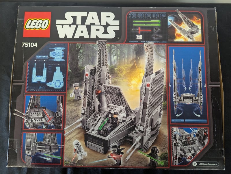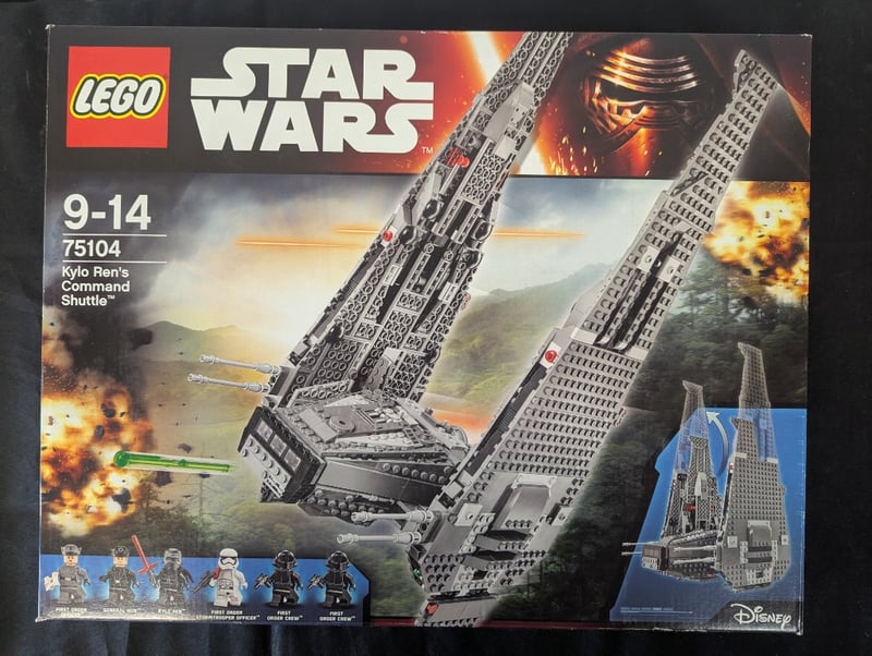 Lego Star Wars Set 75104 Featuring Kylo Ren'S Command Shuttle. Age Range 9-14 Years. Boxed Set Includes Detailed Shuttle Model With Opening Cockpit, Deployable Weapons, And Six Minifigures (First Order Stormtrooper, Officer, Kylo Ren, And Others). Original Packaging Shows Minimal Wear. Includes Instruction Manual And Complete Brick Complement. Circa 2015 Release From The Force Awakens Series.