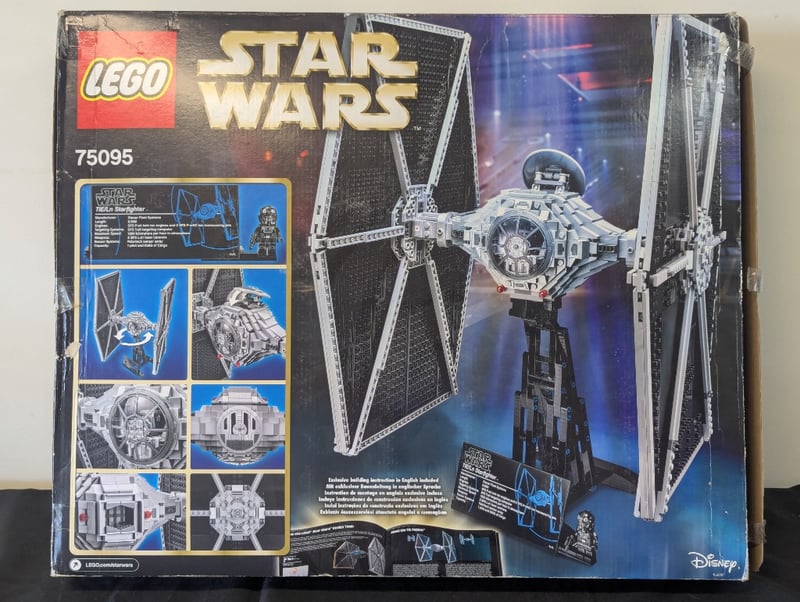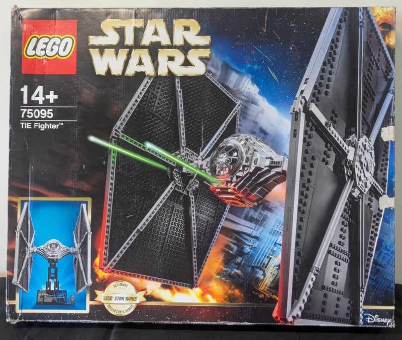 Lego Star Wars Set 75095 Tie Fighter Ultimate Collector Series. Age 14+. Complete Boxed Set Featuring Detailed White And Black Tie Fighter Construction With Poseable Wings, Cockpit Detail, And Minifigure. Original Packaging Shows Display Stand Imagery And Included Accessories. Box Displays Authentic Lego Star Wars Branding With Disney Licensing.