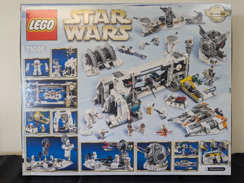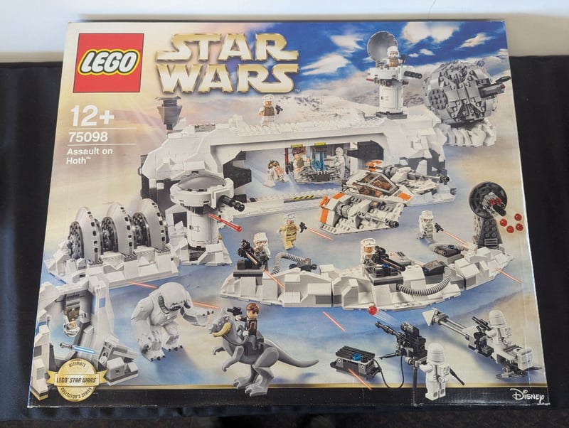 Lego Star Wars Set 75098 "Assault On Hoth" Featuring A Comprehensive Recreation Of The Iconic Ice Planet Base With Modular Structures, Defensive Turrets, And Multiple Minifigures Including Imperial And Rebel Characters. Set Includes At-At Walker, Snowspeeder, And Various Weapons And Accessories. Age Rating 12+. Displayed In Original Factory-Sealed Retail Packaging With Illustrated Box Showing Complete Set Contents And Build Configurations.