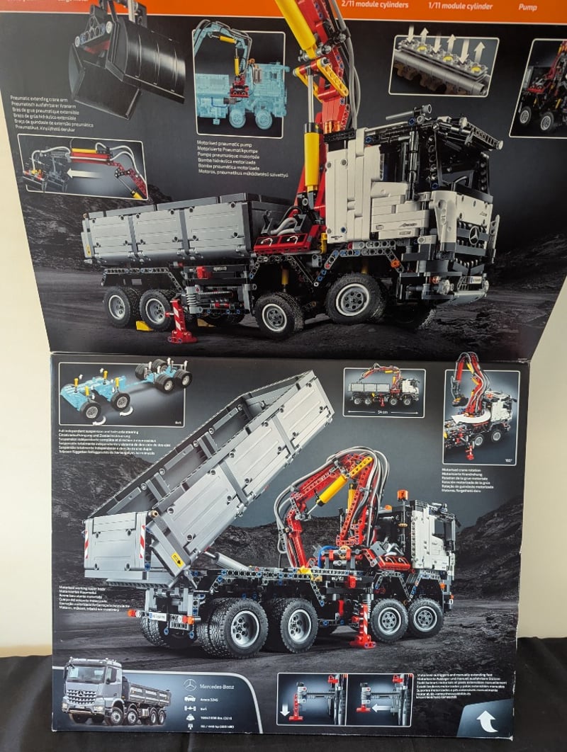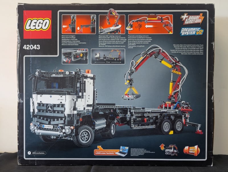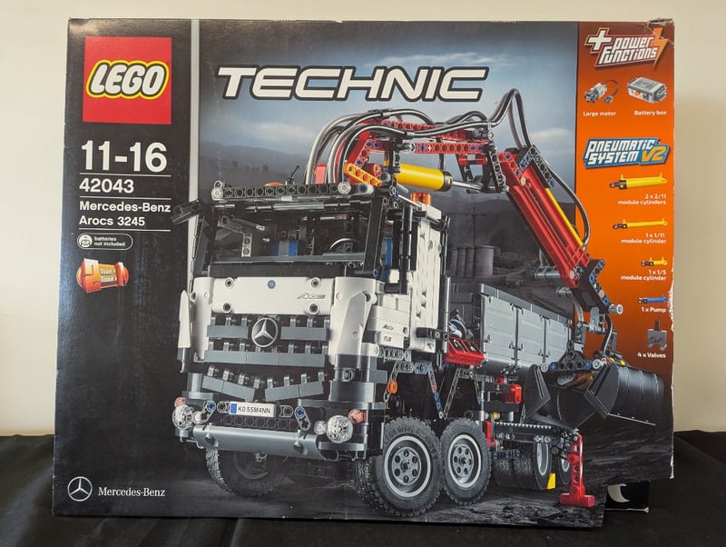 Complete Lego Technic Construction Set Featuring A Detailed Mercedes-Benz Arocs 3245 Articulated Truck With Motorized Hydraulic Crane Arm, Pneumatic System V2 With Cylinders And Pump, Battery Box, Large Motor, And Functional Articulated Tipper Trailer. Age Range 11-16 Years. Includes Working Crane Mechanism With Grab Attachment, Pneumatic Controls, And Multiple Building Configurations. Set Number 42043.