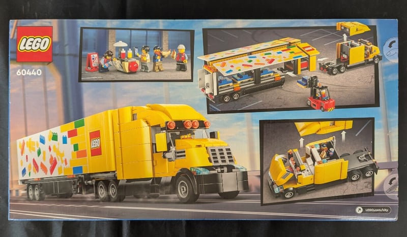 Lego City Delivery Truck Set 60440 Featuring A Large Yellow Articulated Delivery Truck With Iconic Lego Brick Graphics, Complete With Detachable Cargo Trailer, Forklift, Minifigures, And Lego Brick Cargo Boxes. Includes Multiple Playsets Depicting Warehouse And Logistics Operations With Detailed Building Elements And Functional Moving Parts.
