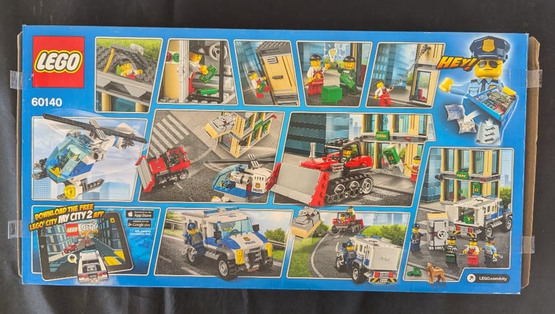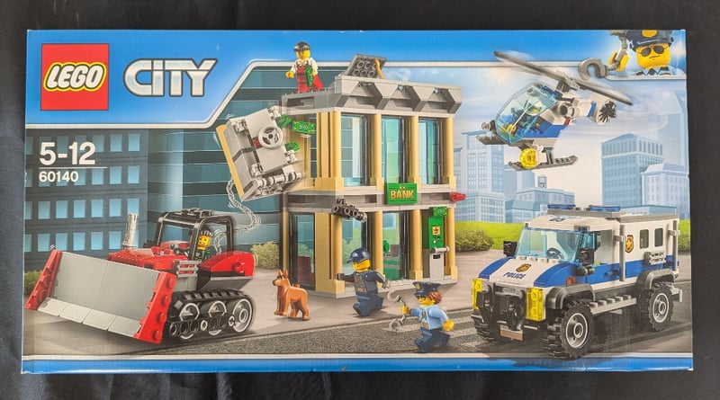 Lego City Set 60140 Featuring A Detailed Bank Building With Removable Safe, Red Snow Plow Vehicle, Police Truck, Helicopter, And Five Minifigures Including Police Officer And Robber. Complete With Instruction Manual And Original Packaging. Suitable For Ages 5-12.