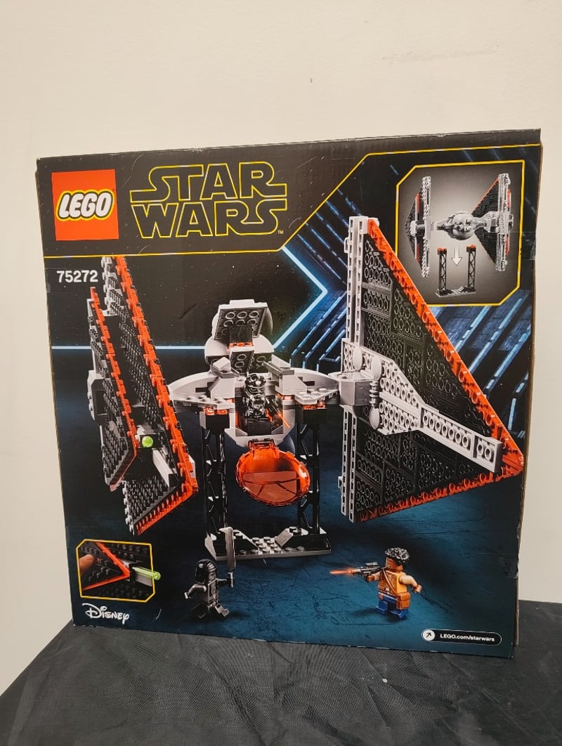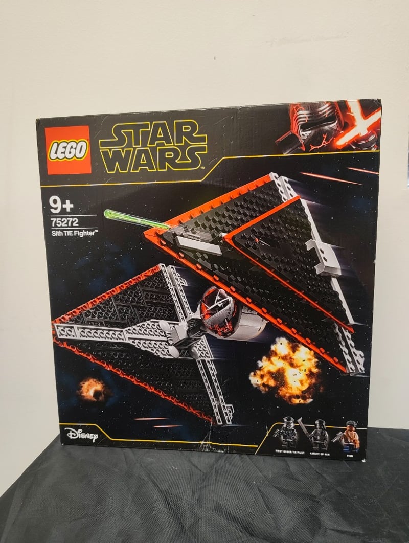 Lego Star Wars Sith Tie Fighter (Set 75272) Featuring An Articulated Red And Black Starfighter With Opening Cockpit, Poseable Wings, And Detailed Minifigure Accessories. Box Shows Minor Wear Consistent With Storage And Display. Includes Illustrated Packaging With Construction Imagery And Character Lineup. Age Rating 9+ Indicated On Box. Disney/Lego Branding Present.