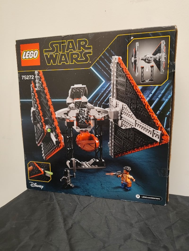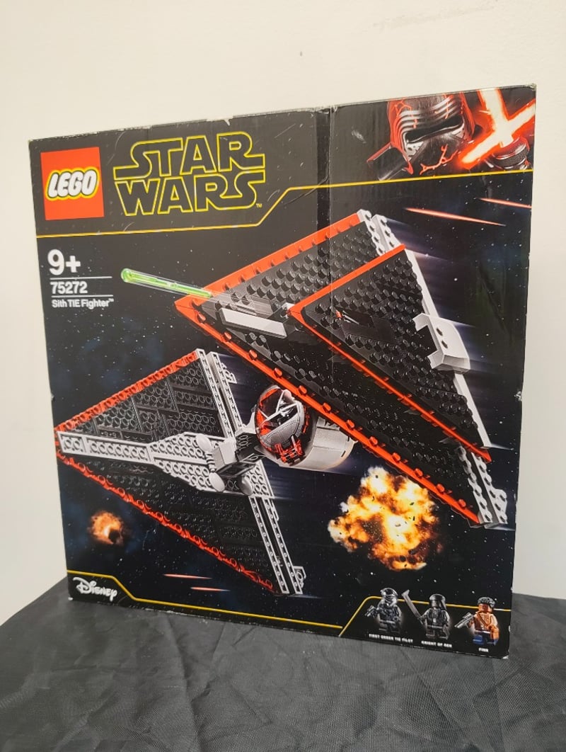 LEGO STAR WARS SITH TIE FIGHTER SET 75272Lego Star Wars Sith Tie Fighter (Set 75272) Featuring An Articulated Red And Black Starfighter With Opening Cockpit, Poseable Wings, And Detailed Minifigure Accessories. Box Shows Minor Wear Consistent With Storage And Display. Includes Illustrated Packaging With Construction Imagery And Character Lineup. Age Rating 9+ Indicated On Box. Disney/Lego Branding Present.584526+16