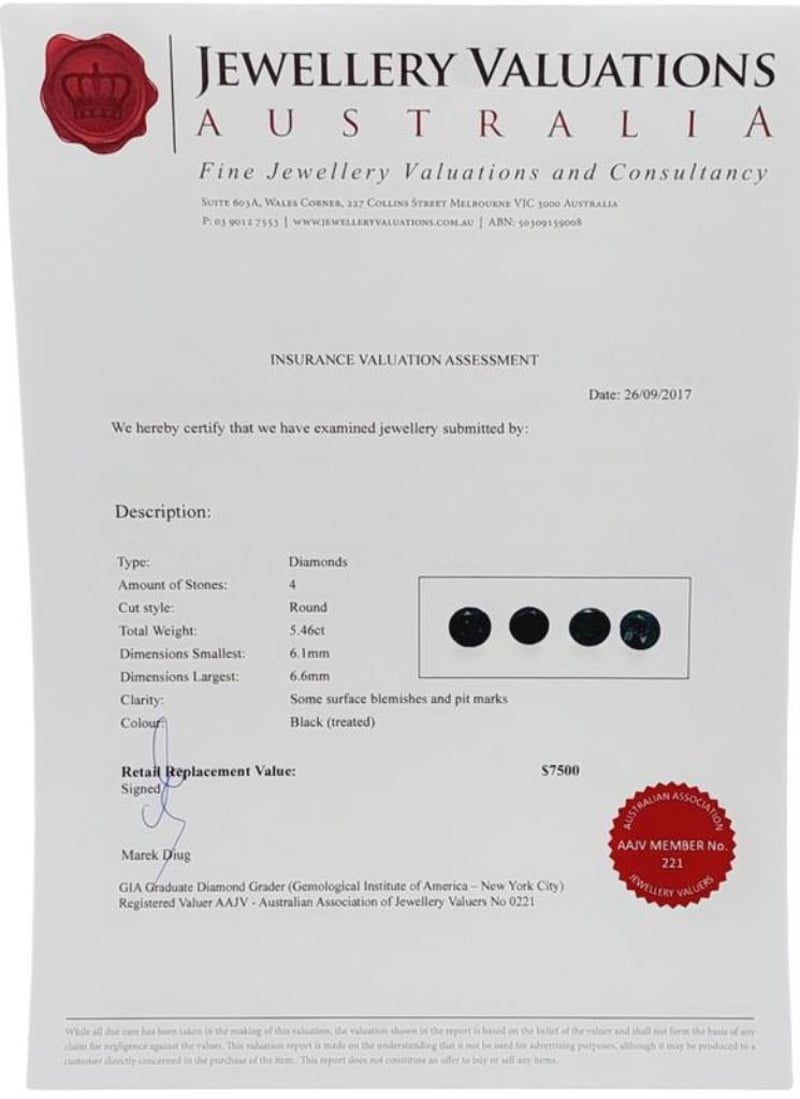 5.46 TCW ROUND CUT BLACK DIAMONDS Four (4) Round Cut Black Diamonds With A Combined Weight Of 5.46Ct And Measuring Approx. 6.1Mm - 6.6Mm In Diameter Have Been Colour Treated Black And Have Some Surface Blemishes And Pit Marks. Jewellery Valuations Provided By A Third Party Professional Not Directly Associated With Lloyds Auctions at AUD $7500This Insurance Valuation has been provided by a registered Jewellery Valuer and is intended for insurance purposes only. The valuation amount has no bearing on the auction value of the item. Any questions regarding the valuation should be directed to the issuing Valuer (refer to contact details on the certificate) as Lloyds have no association or relationship with the Valuer or the valuation amount contained within the valuation. Condition: Excellent- Refer Images 0162901+8CROSSDOCK