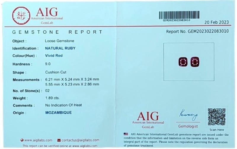 1.89 TCW CUSHION CUT NATURAL AIG GRADED MOZAMBIQUE RUBIES (PAIR) Shape: Cushion, Measurements: 6.21Mm X 5.24Mm X 3.24Mm & 5.55Mm X 5.23Mm X 2.86Mm, Total Carat Weight: 1.89, Colour: Vivid Red, Hardness: 9.0, Treatment: No Indication Of Heat Item Is Accompanied By Aig Certificate Number: Gem2023022083010 Condition: Excellent- Refer Images 0 162901+36 CROSSDOCK