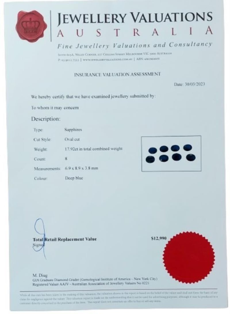 17.92 TCW OVAL CUT BLUE SAPPHIRES Offer Of Eight (8) Stones, Shape: Oval, Colour: Deep Blue, Stone Dimensions: 6.9Mm X 8.9Mm X 3.8Mm Jewellery Valuations Provided By A Third Party Professional Not Directly Associated With Lloyds Auctions at AUD $12990 This Insurance Valuation has been provided by a registered Jewellery Valuer and is intended for insurance purposes only. The valuation amount has no bearing on the auction value of the item. Any questions regarding the valuation should be directed to the issuing Valuer (refer to contact details on the certificate) as Lloyds have no association or relationship with the Valuer or the valuation amount contained within the valuation. Condition: Excellent- Refer Images 0 162901+37 CROSSDOCK