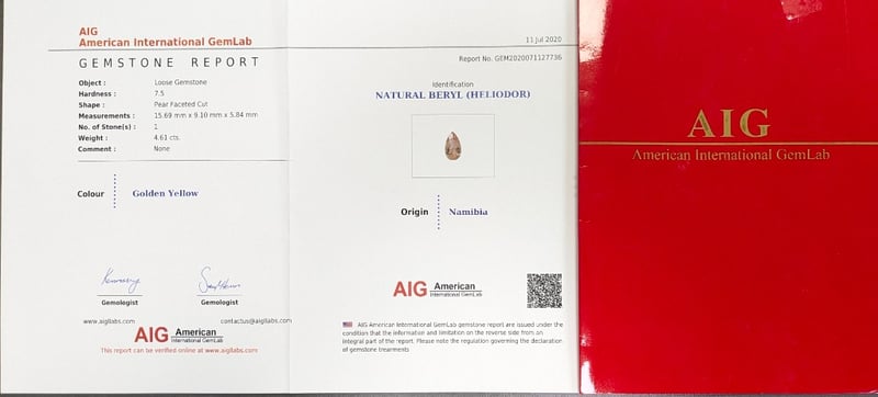 4.61CTS PEAR CUT NATURAL BERYL (HELIODOR) 4.61Cts, Natural Beryl (Heliodor). Hardness: 7.5. Pear Faceted Cut. Colour: Golden Yellow. Origin: Namibia Accompanied By Gemstone Report By Aig. Report No. Gem2020071127736 Dimensions: Height: 15.69mm, Width: 9.10mm, Depth: 5.84mm Condition: Good - Refer To Images FC 163121+5